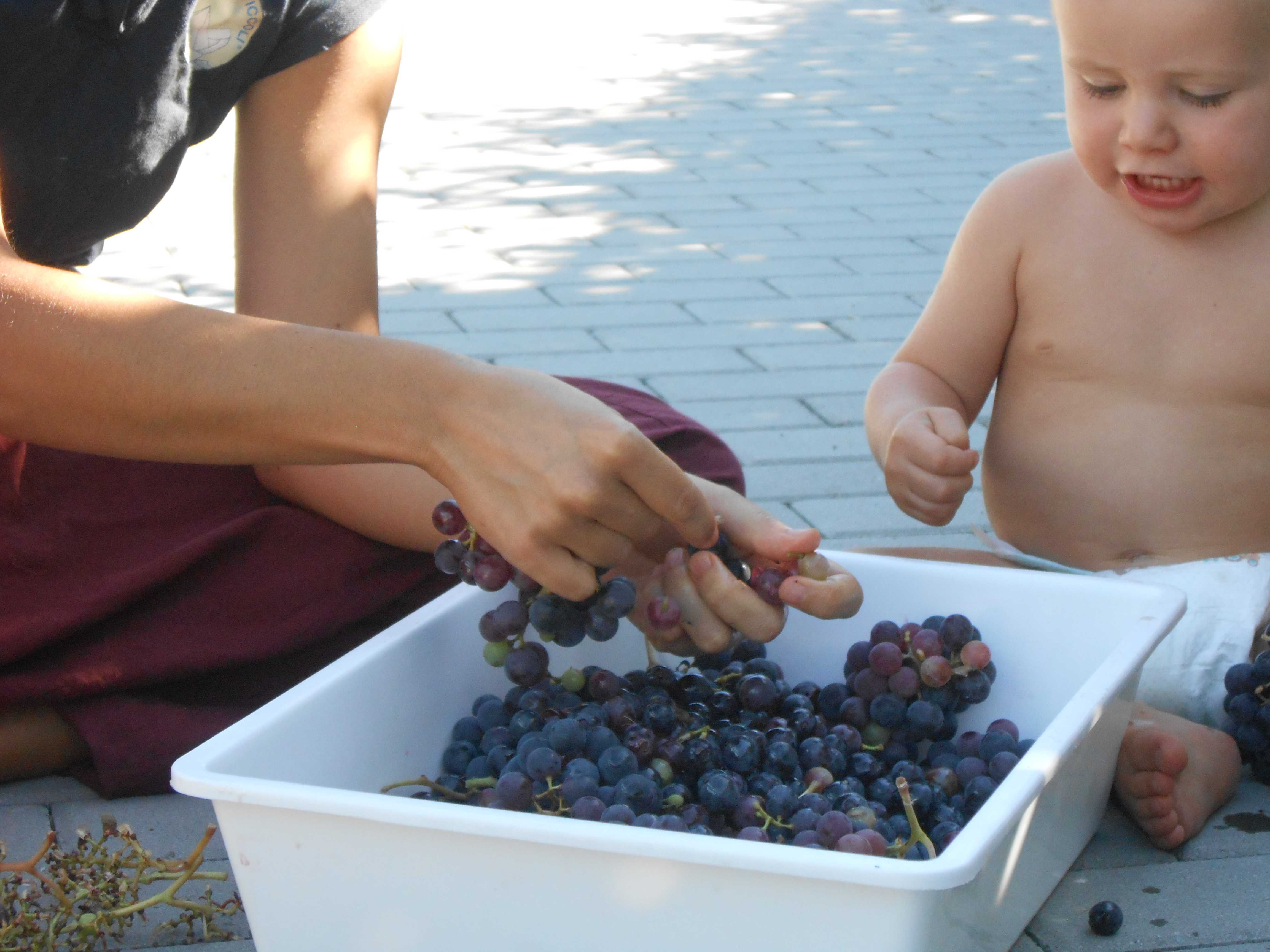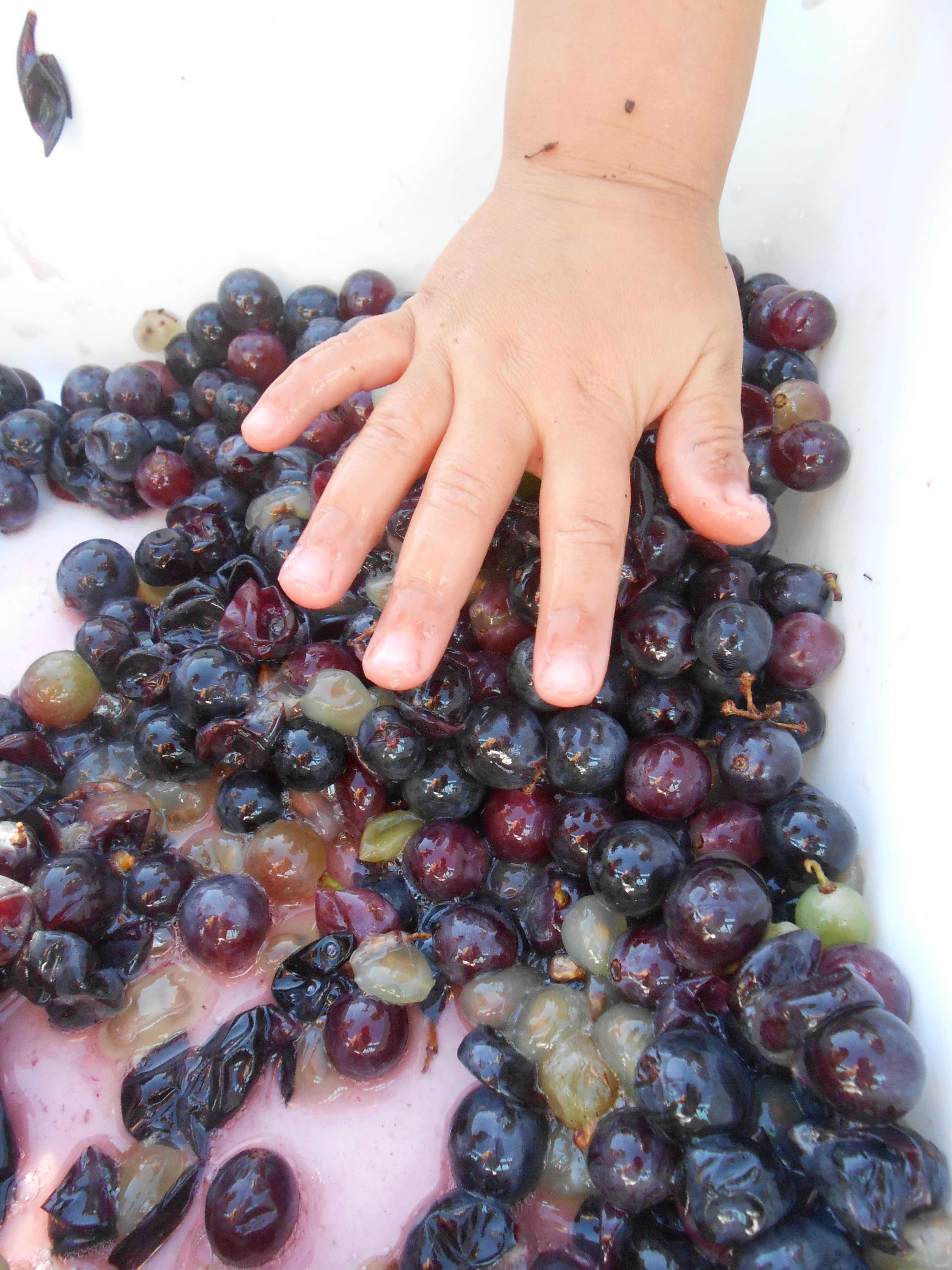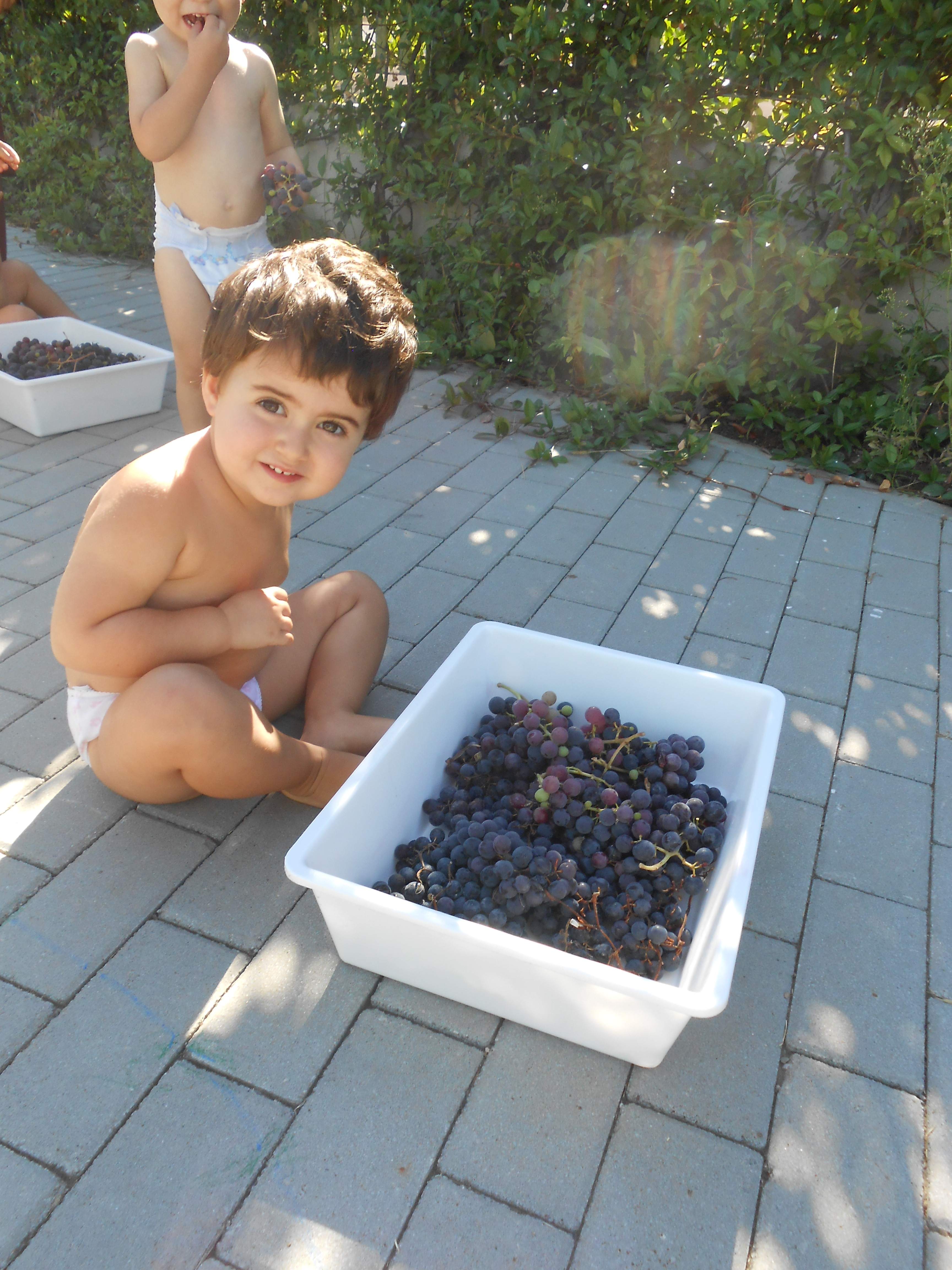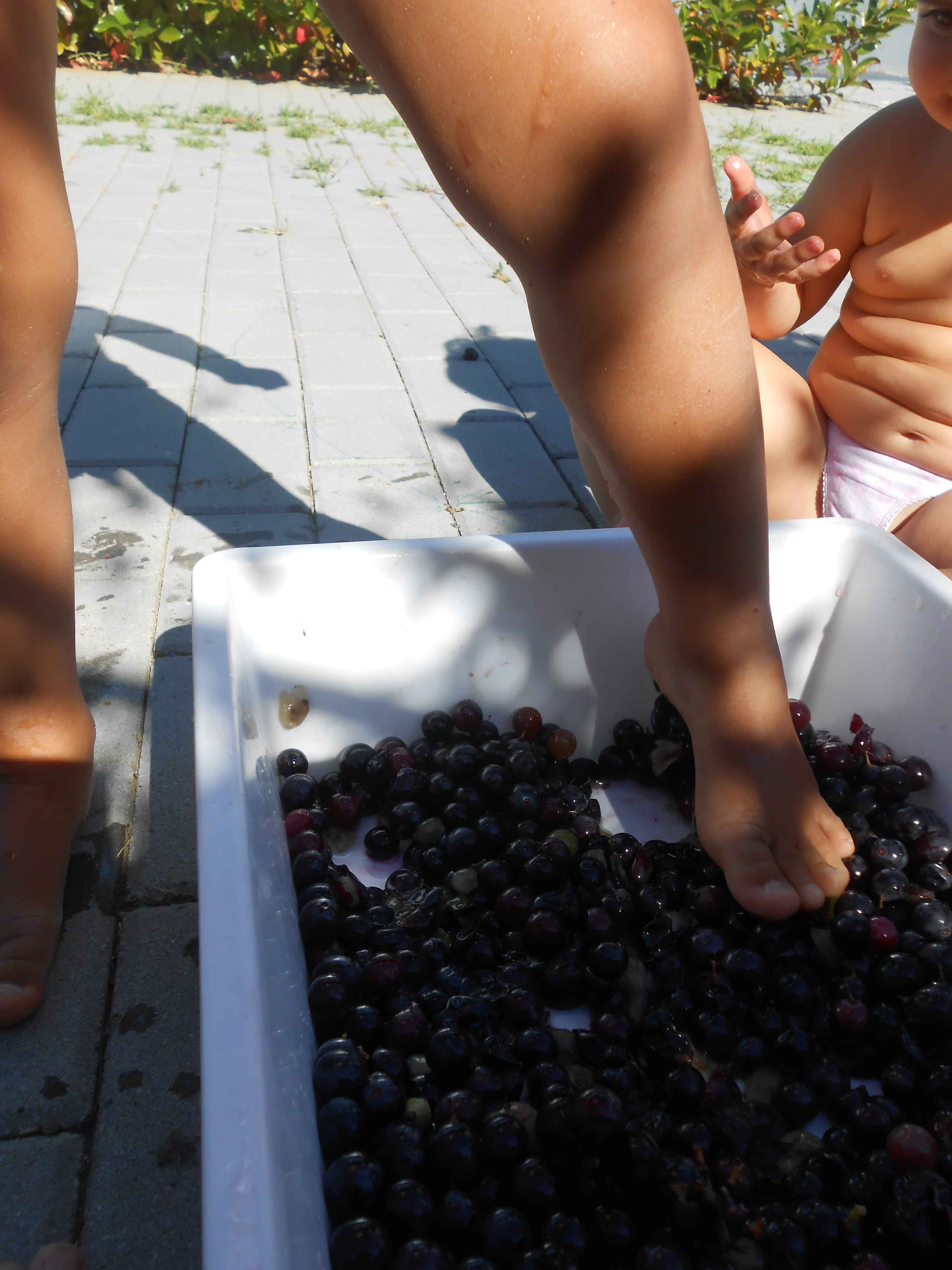 In pannolino o slip, con mani e piedi liberi, laviamo l’uva, stacchiamo i chicchi, la schiacciamo, la pestiamo fino a far uscire un succo scuro, scopriamo che a volte è difficile e non ci riesce come vorremmo, ma poi  assaggiamo e disegnamo… finchè la voglia di capire e di giocare si esaurisce da sé e soddisfatti ci laviamo anche noi, un po’ come i chicchi d’uva, dentro una grande bacinella!