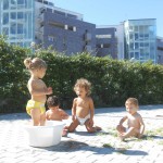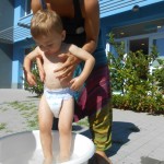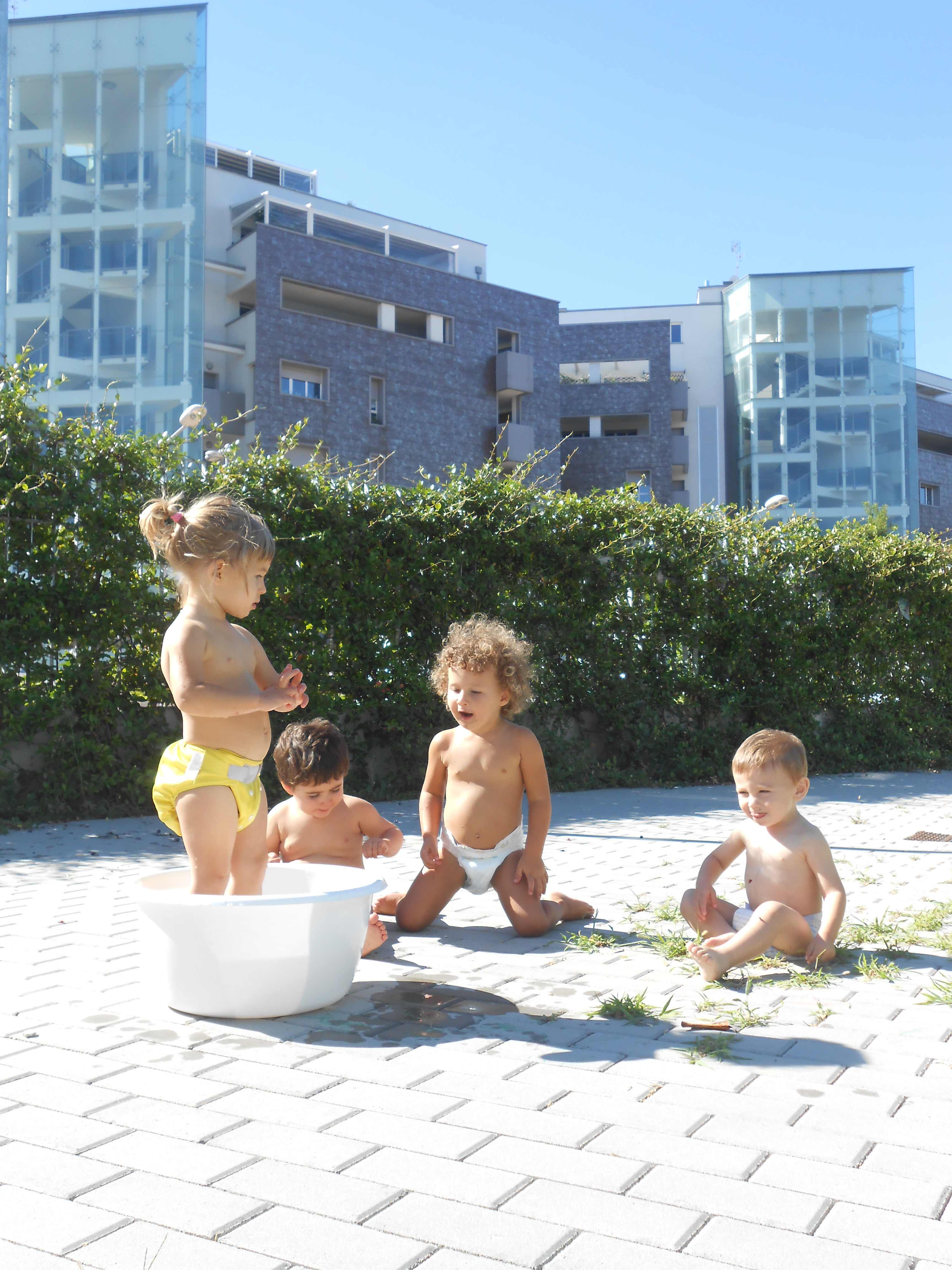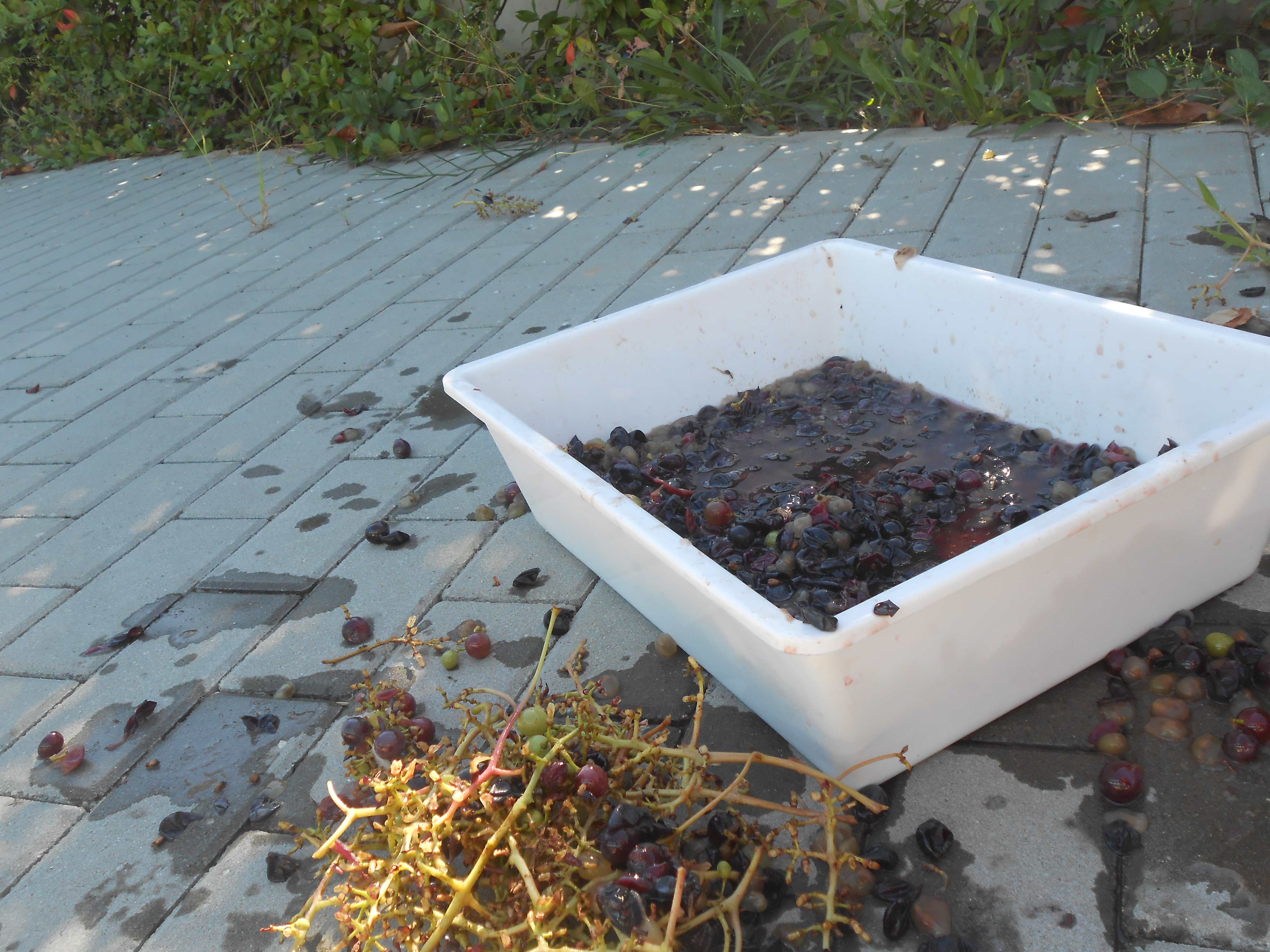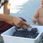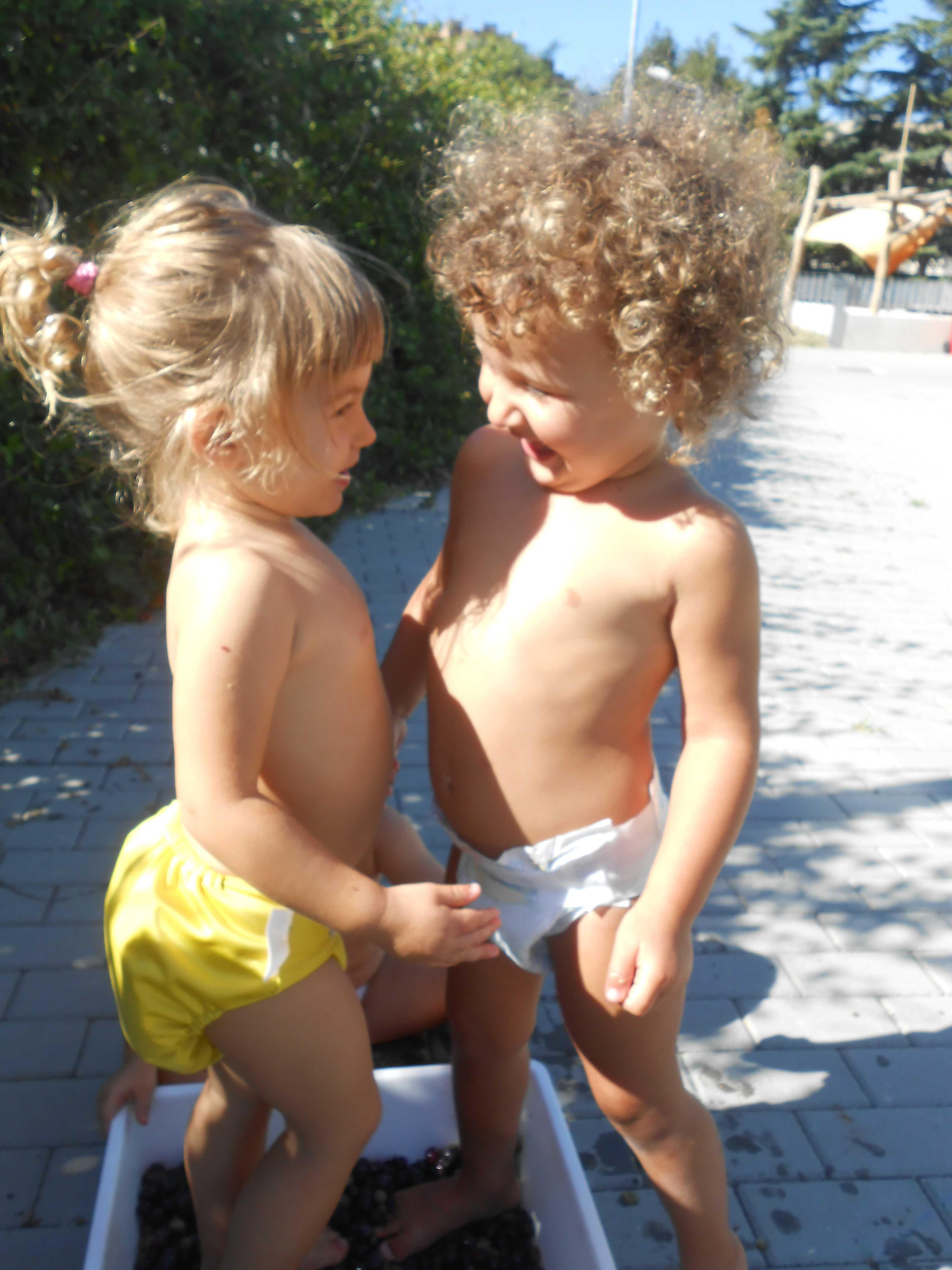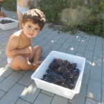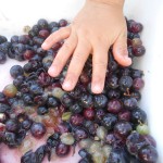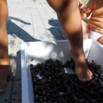In pannolino o slip, con mani e piedi liberi, laviamo l’uva, stacchiamo i chicchi, la schiacciamo, la pestiamo fino a far uscire un succo scuro, scopriamo che a volte è difficile e non ci riesce come vorremmo, ma poi  assaggiamo e disegnamo… finchè la voglia di capire e di giocare si esaurisce da sé e soddisfatti ci laviamo anche noi, un po’ come i chicchi d’uva, dentro una grande bacinella!