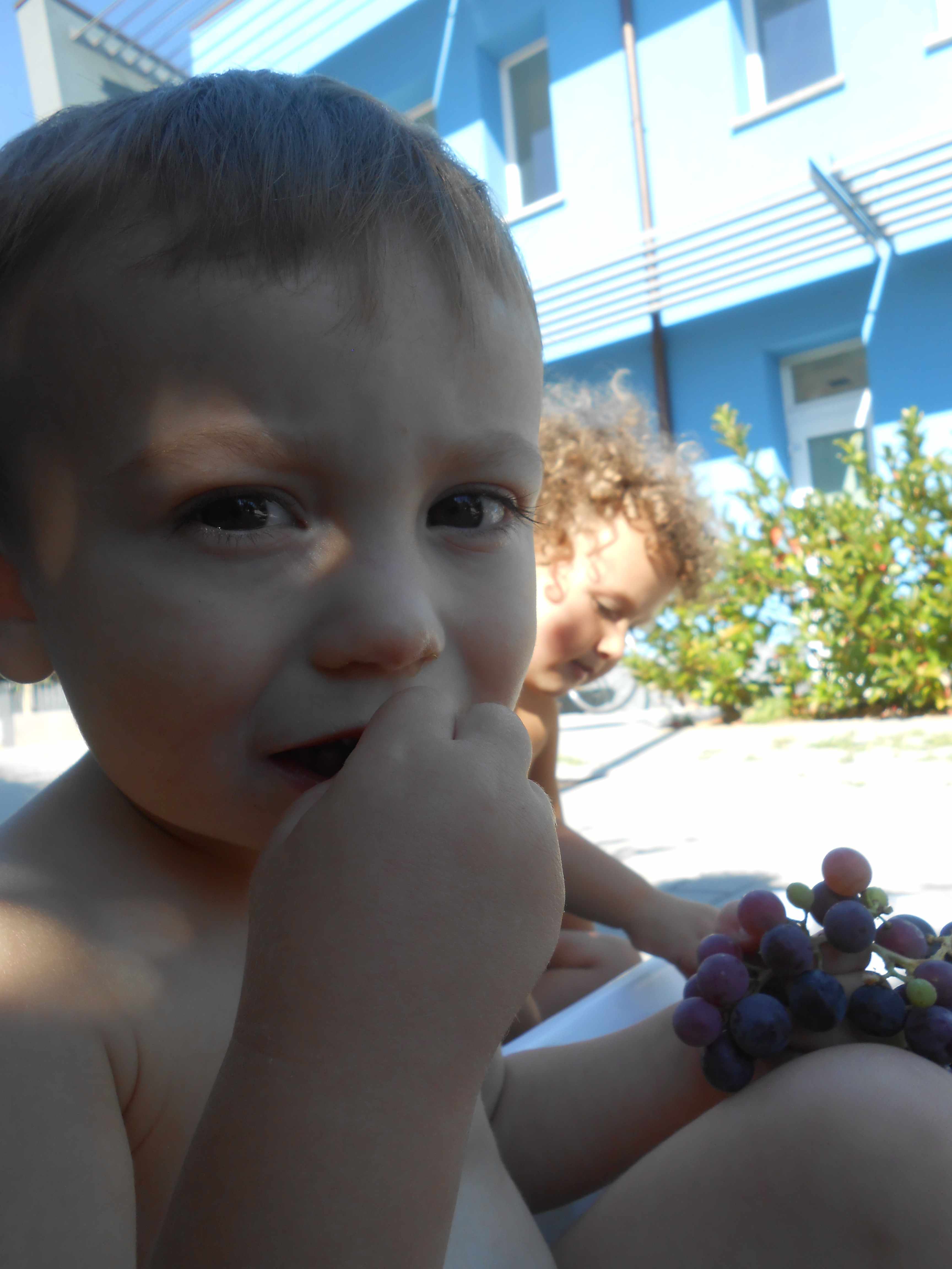 Appena rientrati abbiamo finalmente trovato i grappoli d’uva rossi e maturi che tanto avevamo osservato a luglio, pronti ora  per essere raccolti e mangiati ma anche per diventare giochi, pappe, offerte di scambi e argomento di tante parole…