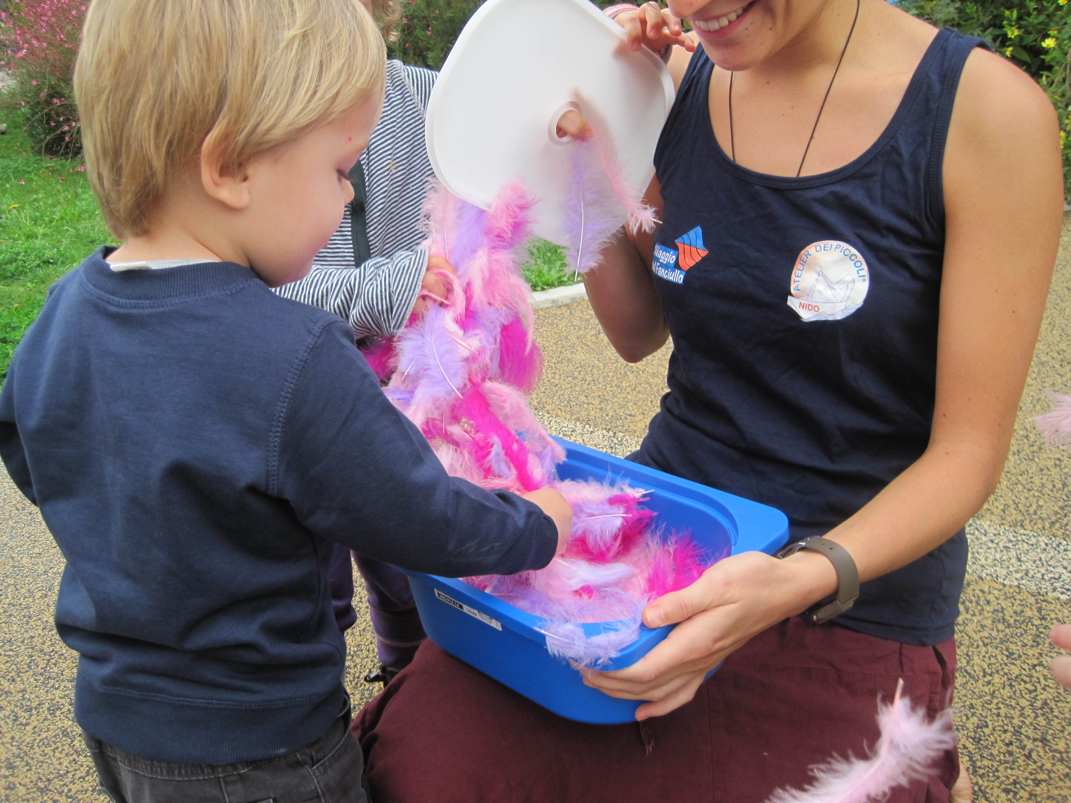 Ci sono anche le foglie, un cesto pieno. Si sono trasformate in farfalle con la lavagna luminosa e le abbiamo sbriciolate tra le mani per giocare. Ora tornano nel prato per nuovi giochi.