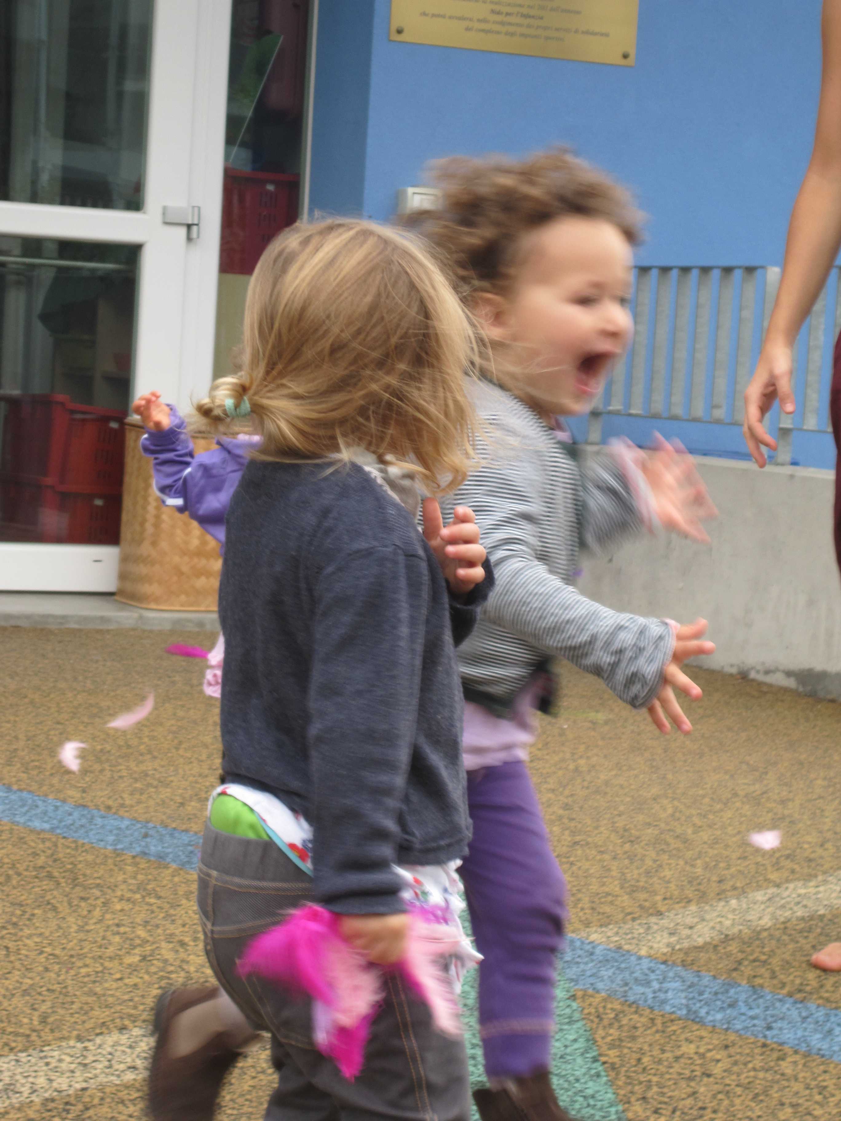Appena fuori  sentiamo il vento sul viso e allora possiamo aprire le braccia, alzare gli occhi e lasciarci accarezzare. Girare in tondo come foglie che cadono …come abbiamo fatto a danza venerdì  scorso.