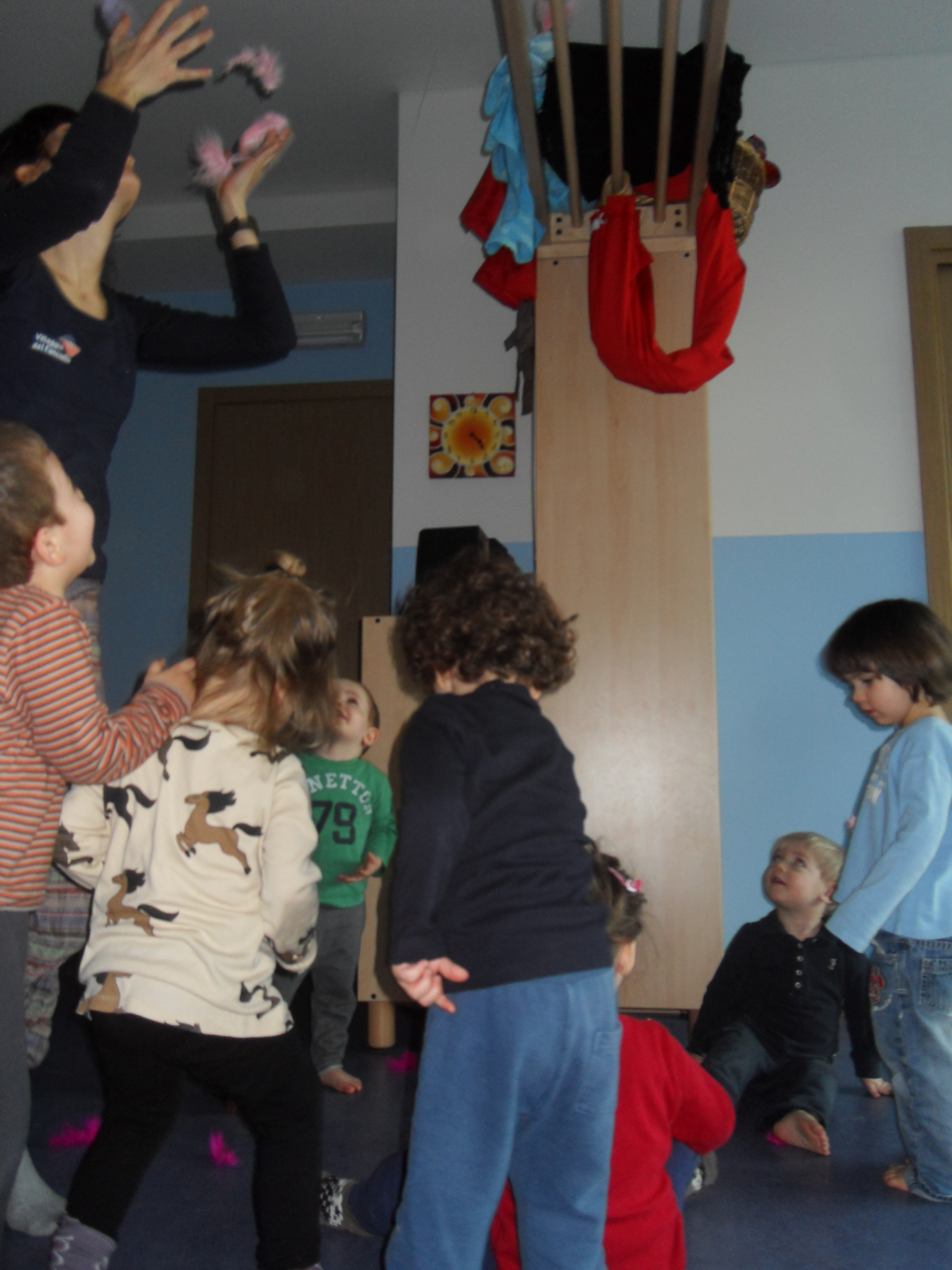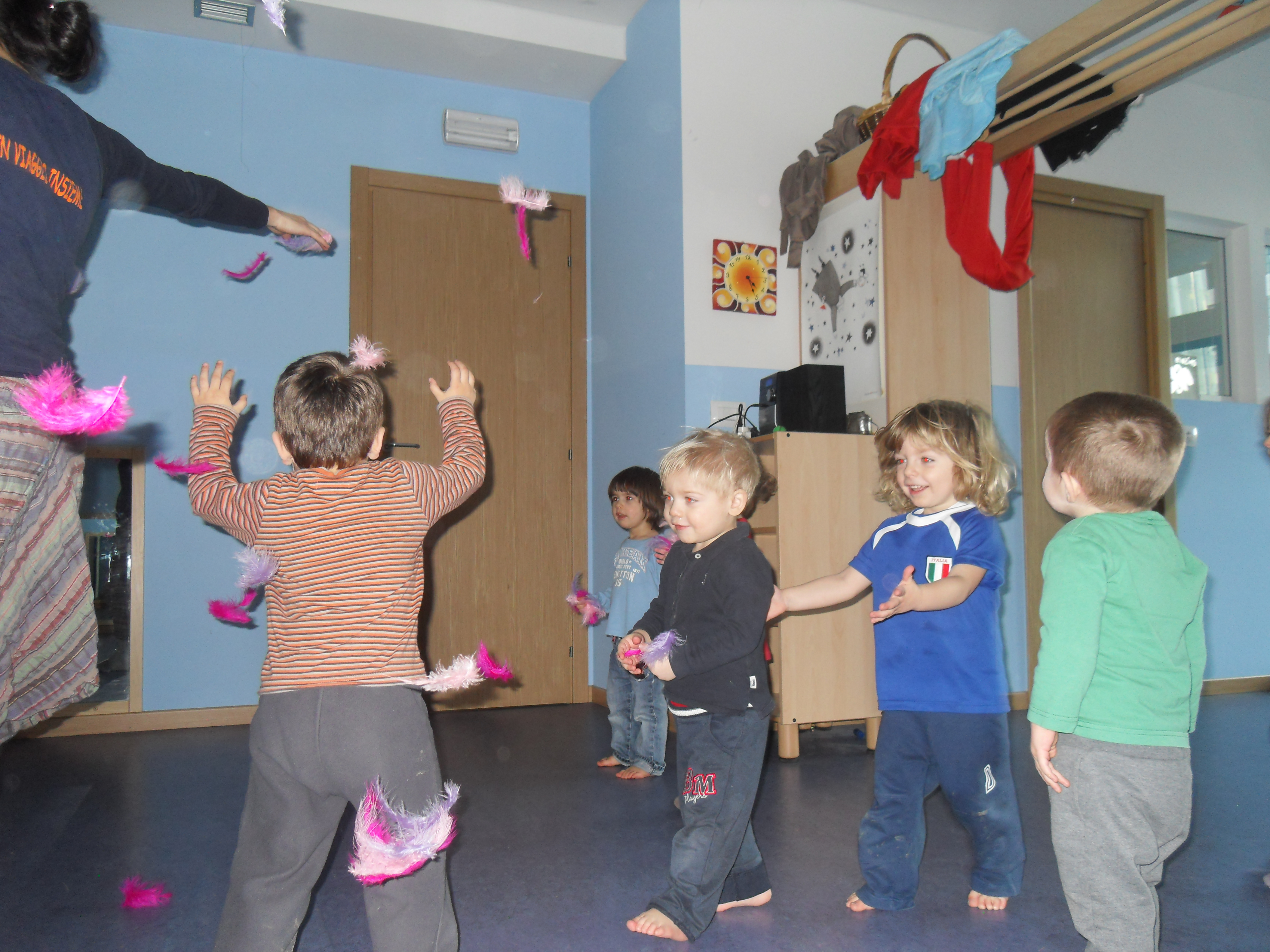 Allora cerchiamo insieme le nostre mani, poi i nostri piedini, poi quelli delle dade… controlliamo se la nostra voce è venuta con noi e se possiamo urlare o sussurrare.