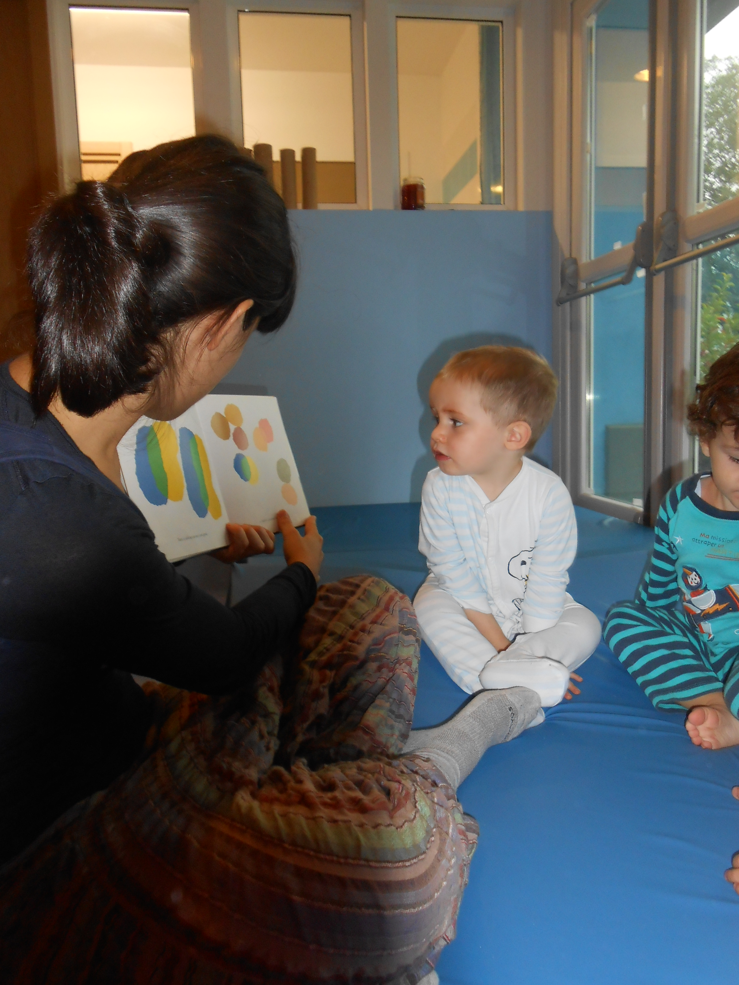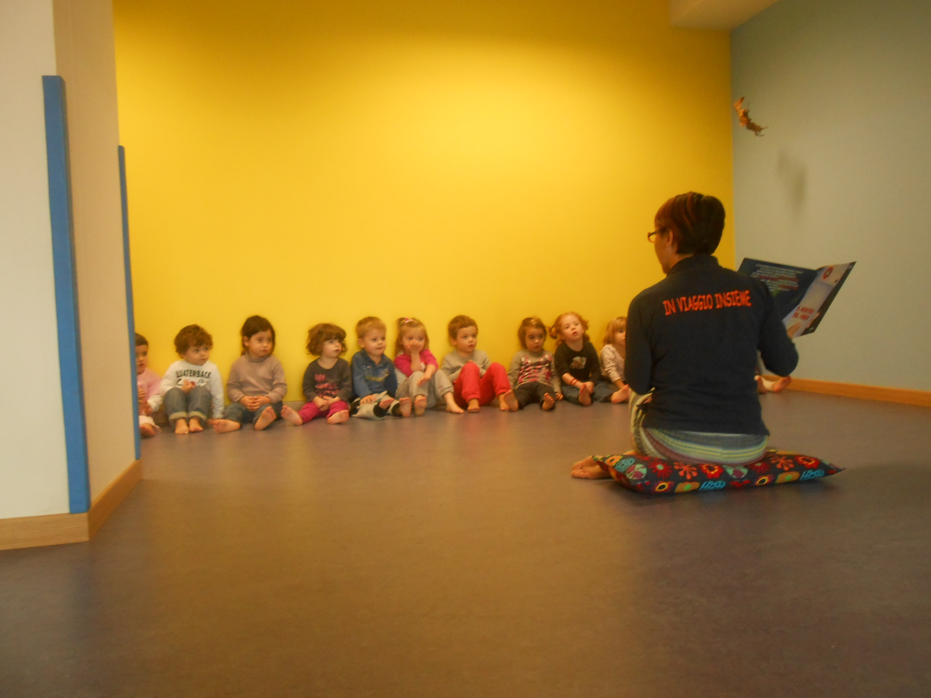 Altre volte ci ritroviamo su tappetoni blu, in palestra, poco prima della nanna, per guardare dei libri e per rilassarci dopo una mattina piena di giochi e di emozioni.