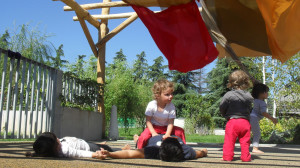 - Un altro punto saldo è il nostro rapporto col Fuori e con la Natura. Amiamo uscire in tutte le stagioni, con tutti i tempi… perché per noi non esiste un cattivo tempo, ma un cattivo equipaggiamento! Stiamo fuori per sperimentare, per conoscere… ma anche solo per respirare, per stare, per apprezzare ciò che c’è… Naturalmente, senza sforzo. Abbiamo un giardino molto bello al Nido Blu, con capanne, cespugli e alberi a misura di bambino dove è possibile arrampicarsi. Abbiamo tane, tronchi e tronchetti in cui sedersi, giocare, saltare, nascondersi. Ci sono le more senza spina, l’uva, le erbette aromatiche, i fiori e le foglie da assaggiare, annusare, ammirare… e il prossimo anno avremo un nuovo spazio all’aperto che si aggiunge a ciò che c’è già in cui realizzeremo anche un piccolo orto giardino! Al Nido Blu giochiamo con il fuori e con il dentro, qualche volta siamo un po’ matte e ci piace portare il fuori dentro e ad esempio.. riempire una stanza di terra per giocare! E Ci piace andare in gita! In un parco, in un’oasi ecologica, nel prato vicino al nido, a vedere i treni, a farci un giro… per esplorare ciò che c’è attorno a noi e farlo conoscere ai bimbi e restare incantate nel vedere i loro occhi che incontrano il mondo.
