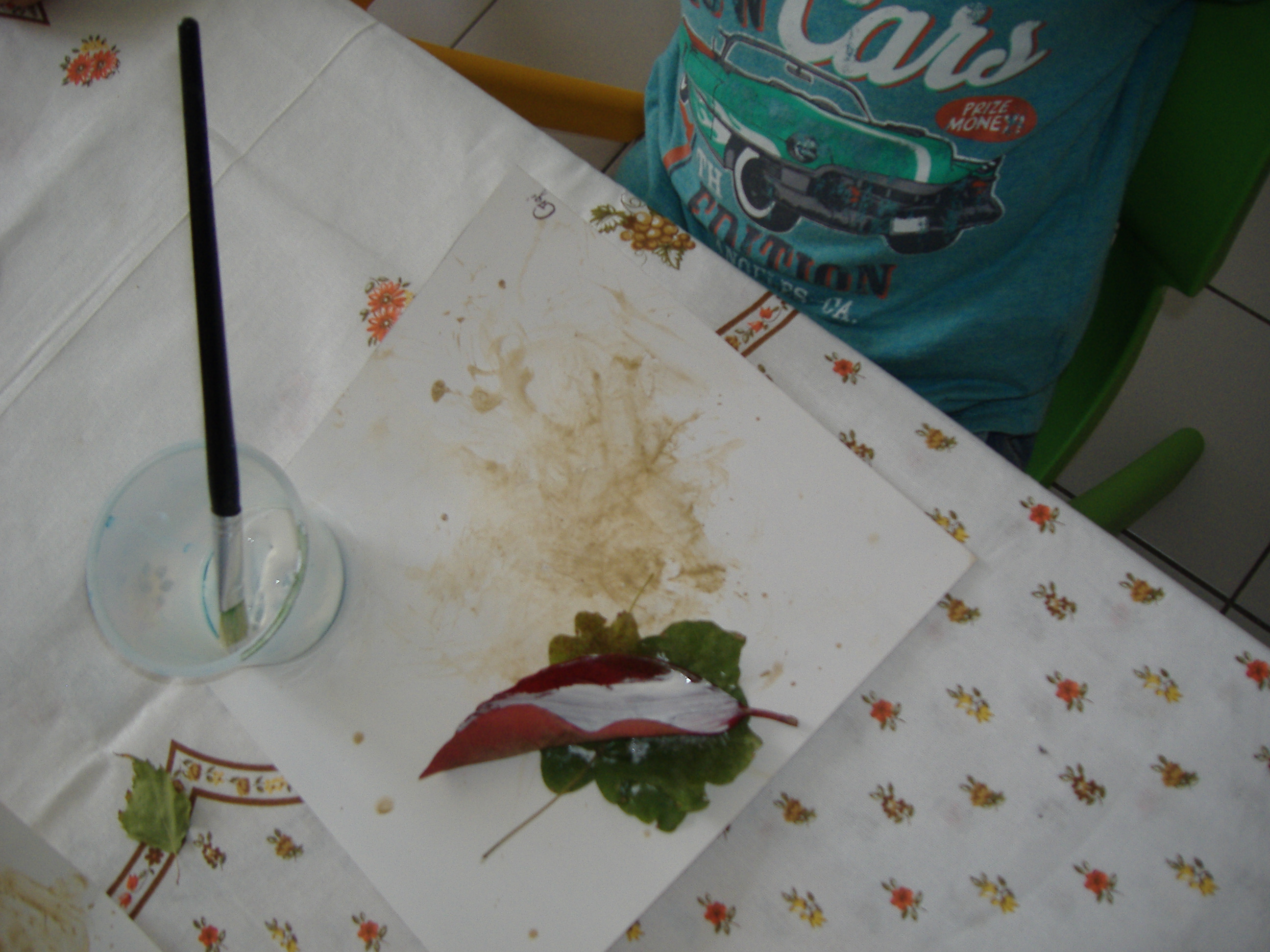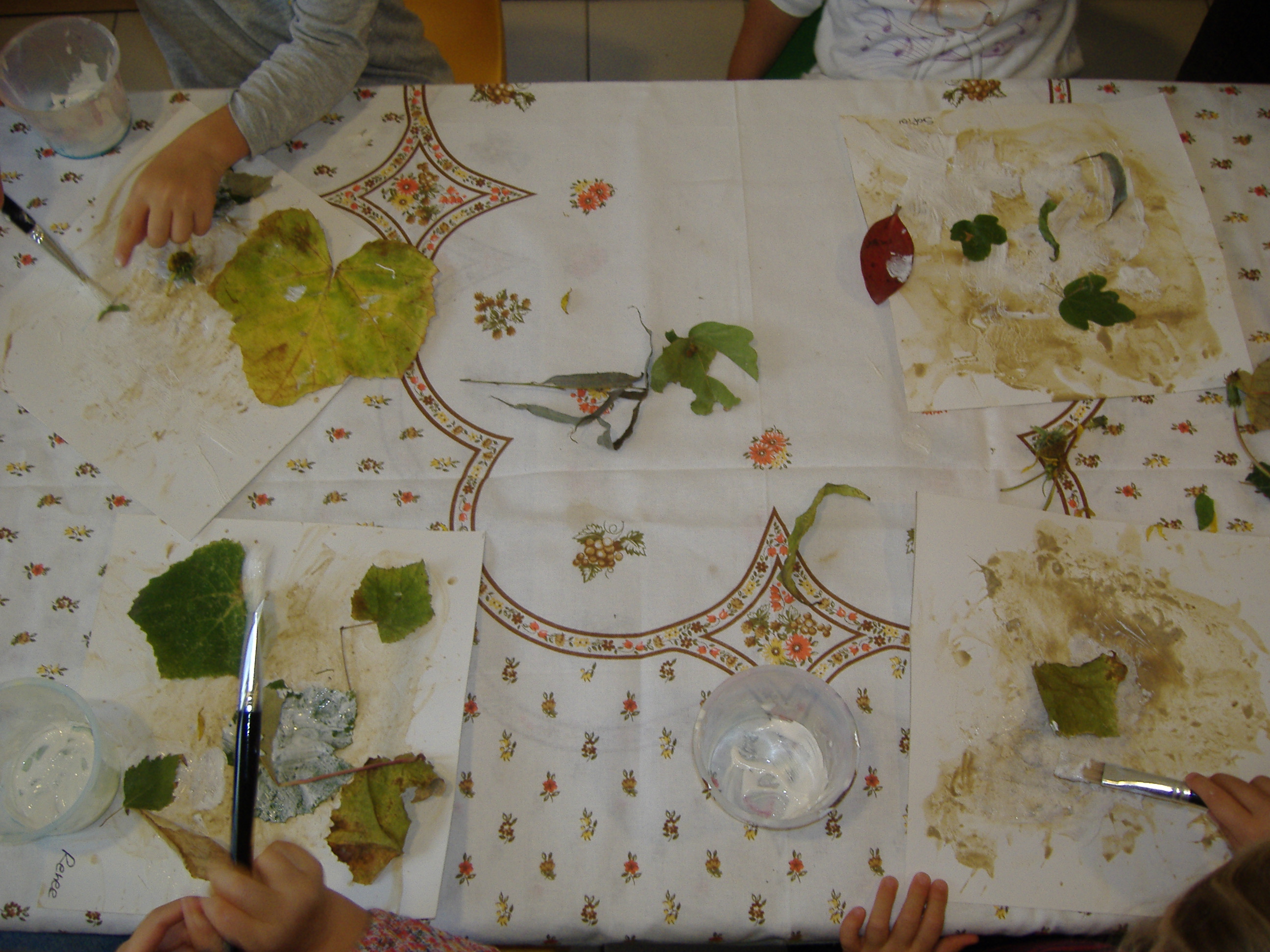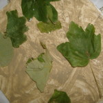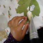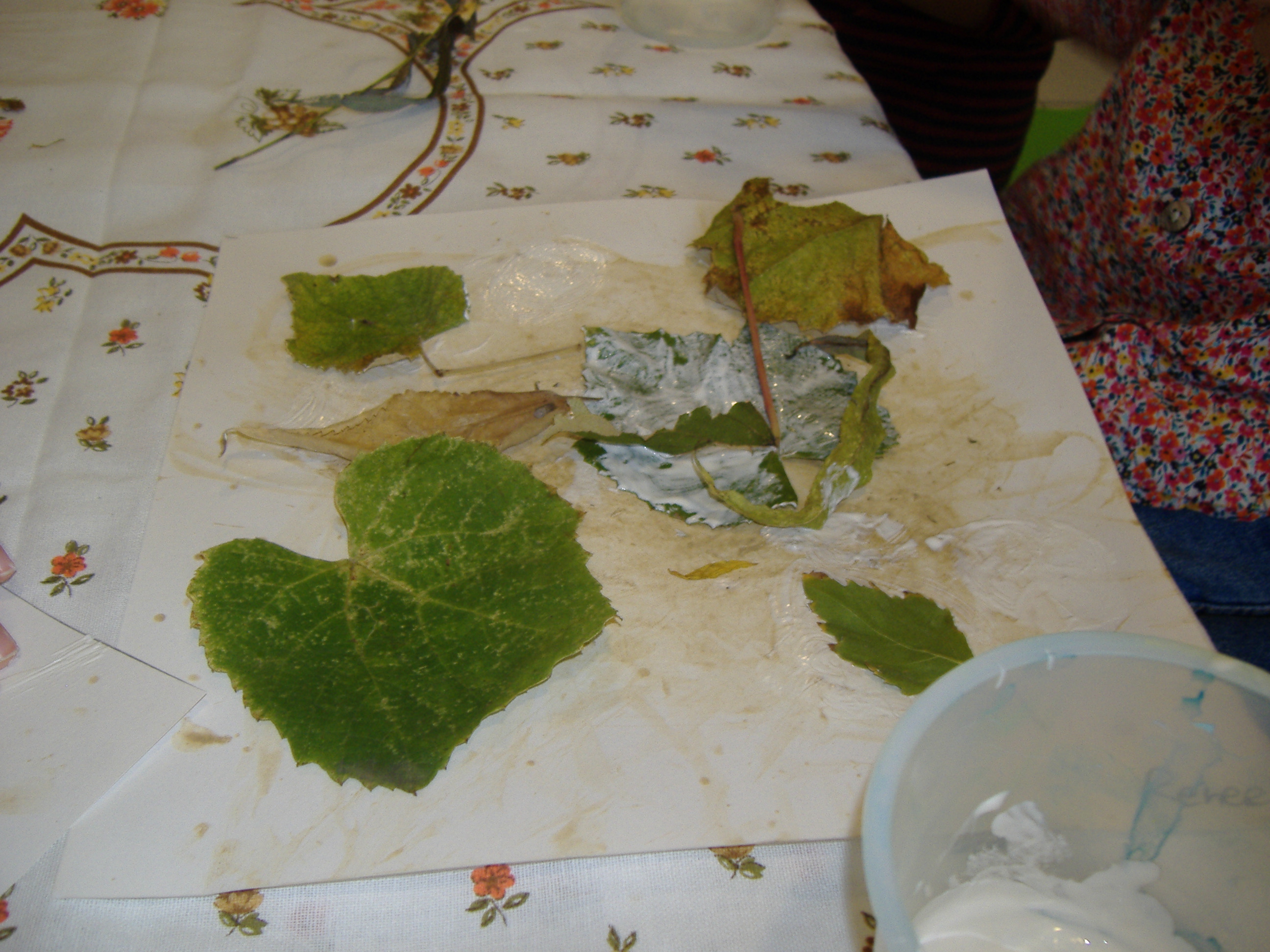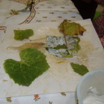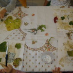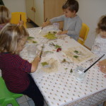 Una volta asciugato il foglio abbiamo deciso di lasciar traccia materica, fisica, incollando foglie grandi e piccole, fiori, fili d’erba che avevamo precedentemente raccolto nel nostro giardino.