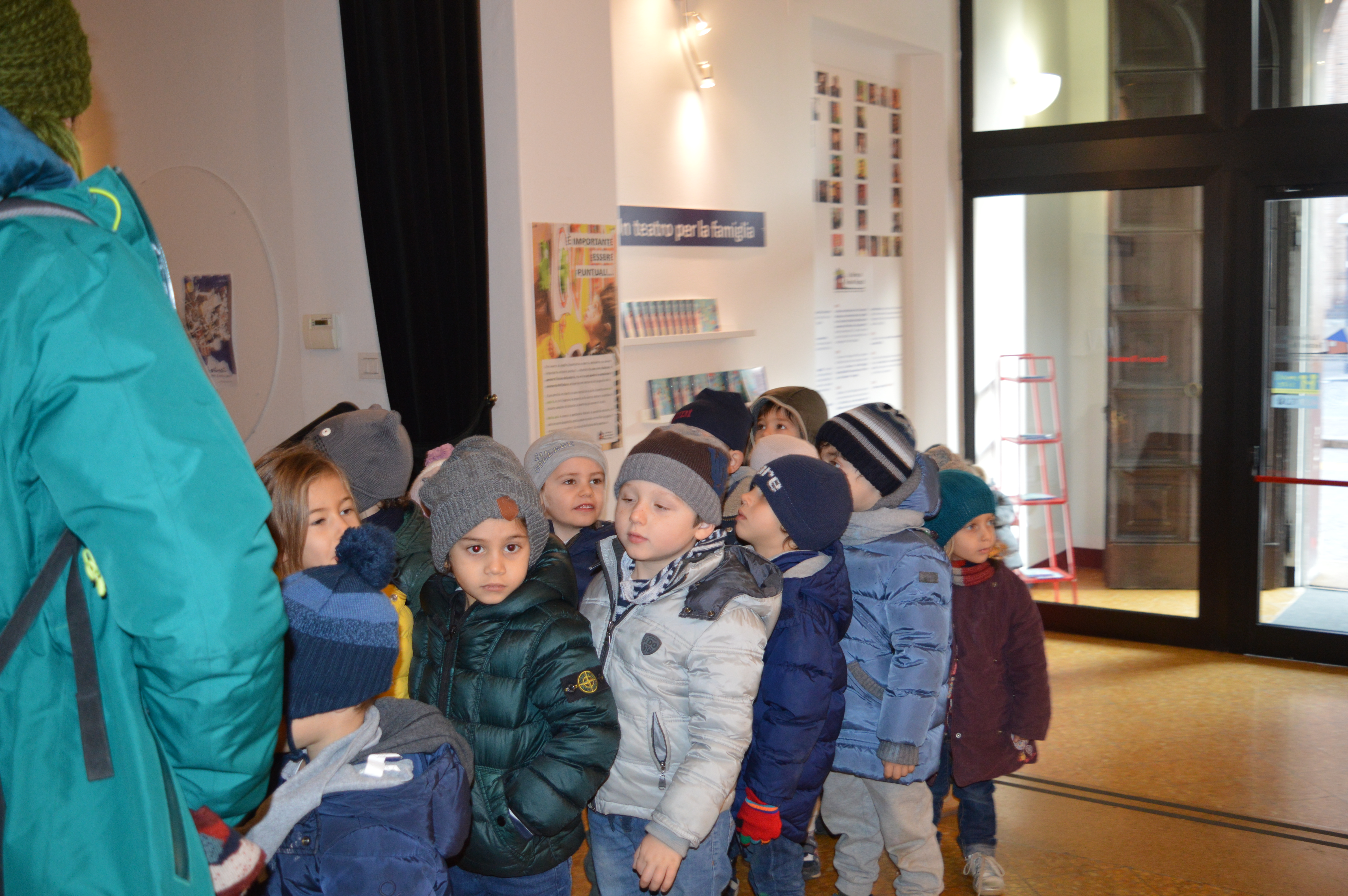 Sblocchiamo la cintura, scendiamo le scale a due a due tenendoci per mano e avanziamo verso la grande porta del teatro, di nuovo le scale e finalmentre entriamo. Aspettiamo , oggi c’è sempre da aspettare un po’! “Ho la pipì!”