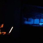 Qualcosa sta per cominciare! Prima litigano scherzando per una sedia, poi lei va e si siede dietro ad un pianoforte, lui va alla sua scrivania dicendo che questo è uno spettacolo di pittura e lei gli ripete che invece è un concerto… che cosa sarà? Lui comincia a disegnare e lei a suonare. Su un grande schermo noi guardiamo i disegni in diretta. “Un albero!” , “ Un lupo!”, “Dada Thea, un pagliaccio!”, “Una scala, un faro… no, l’omino è caduto in acqua!”, “Una scatola!”.