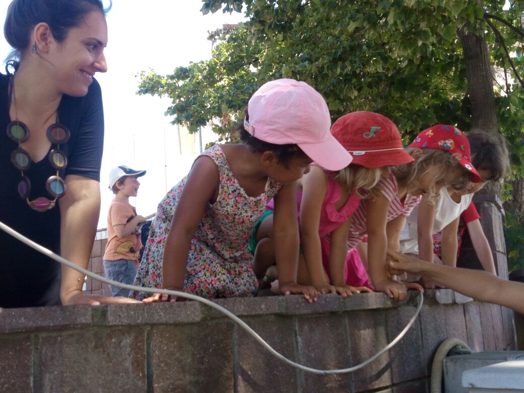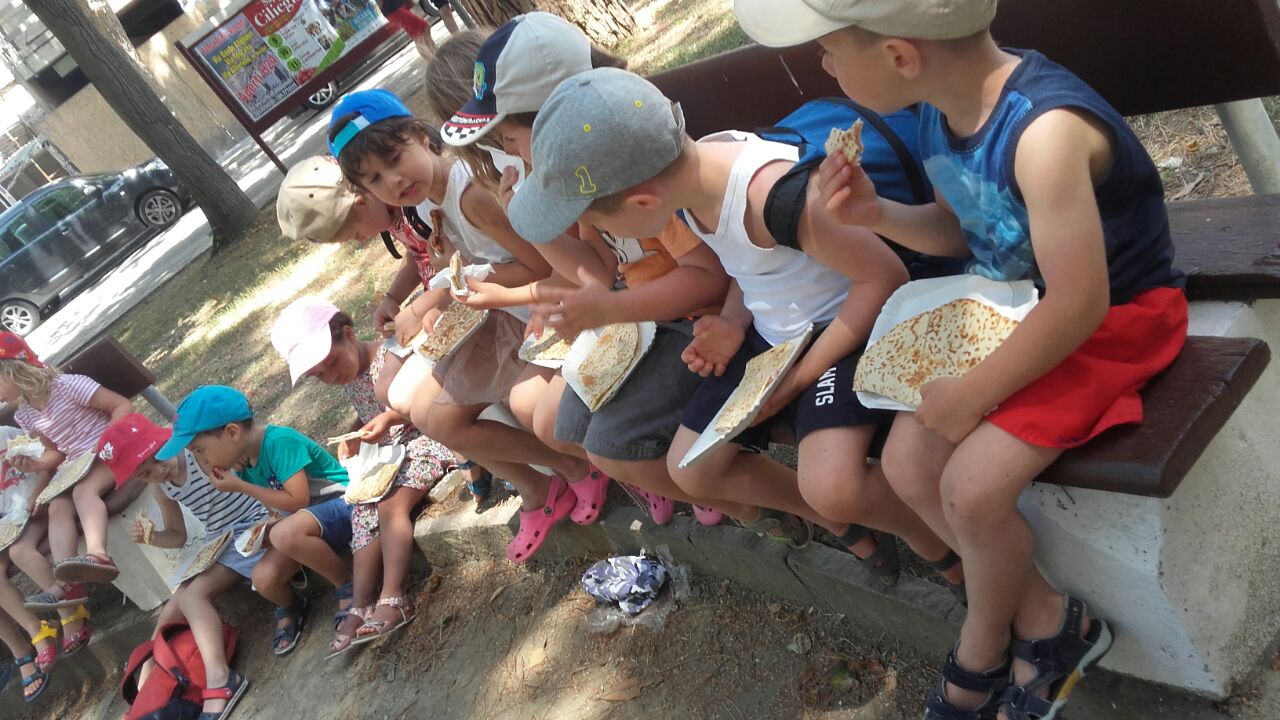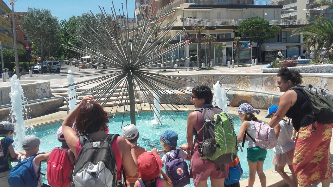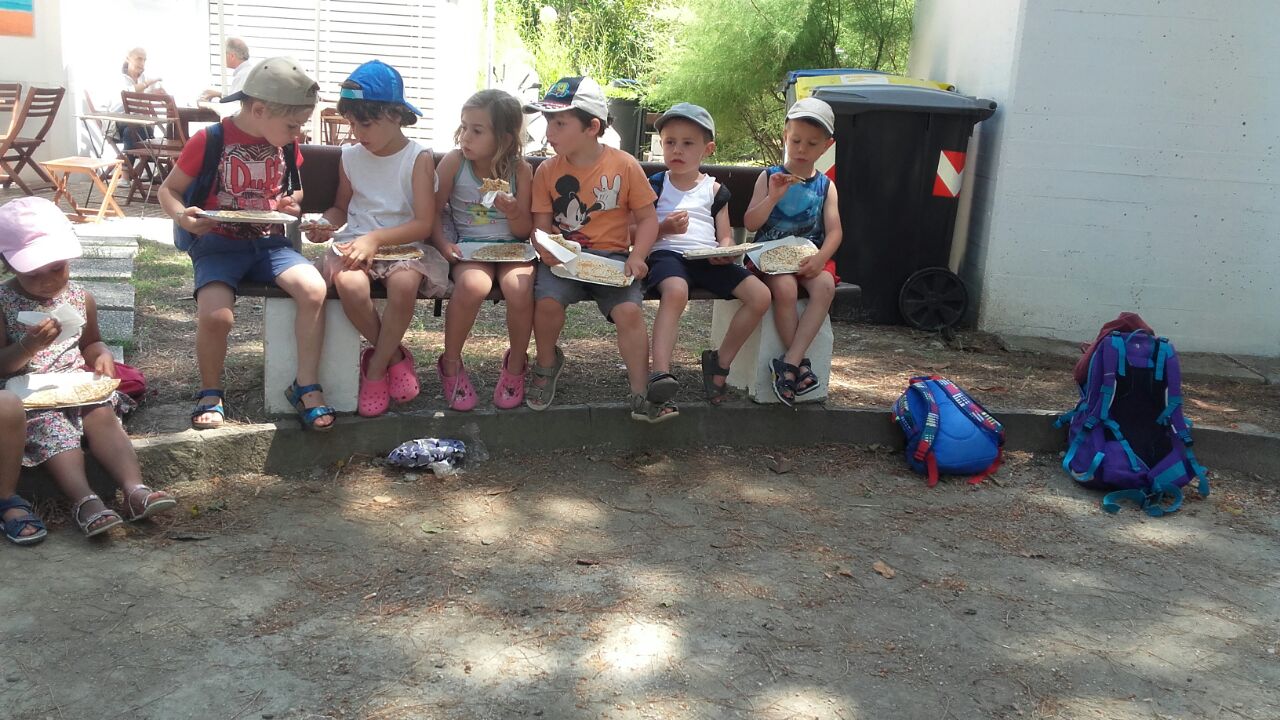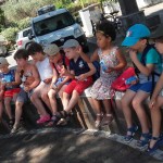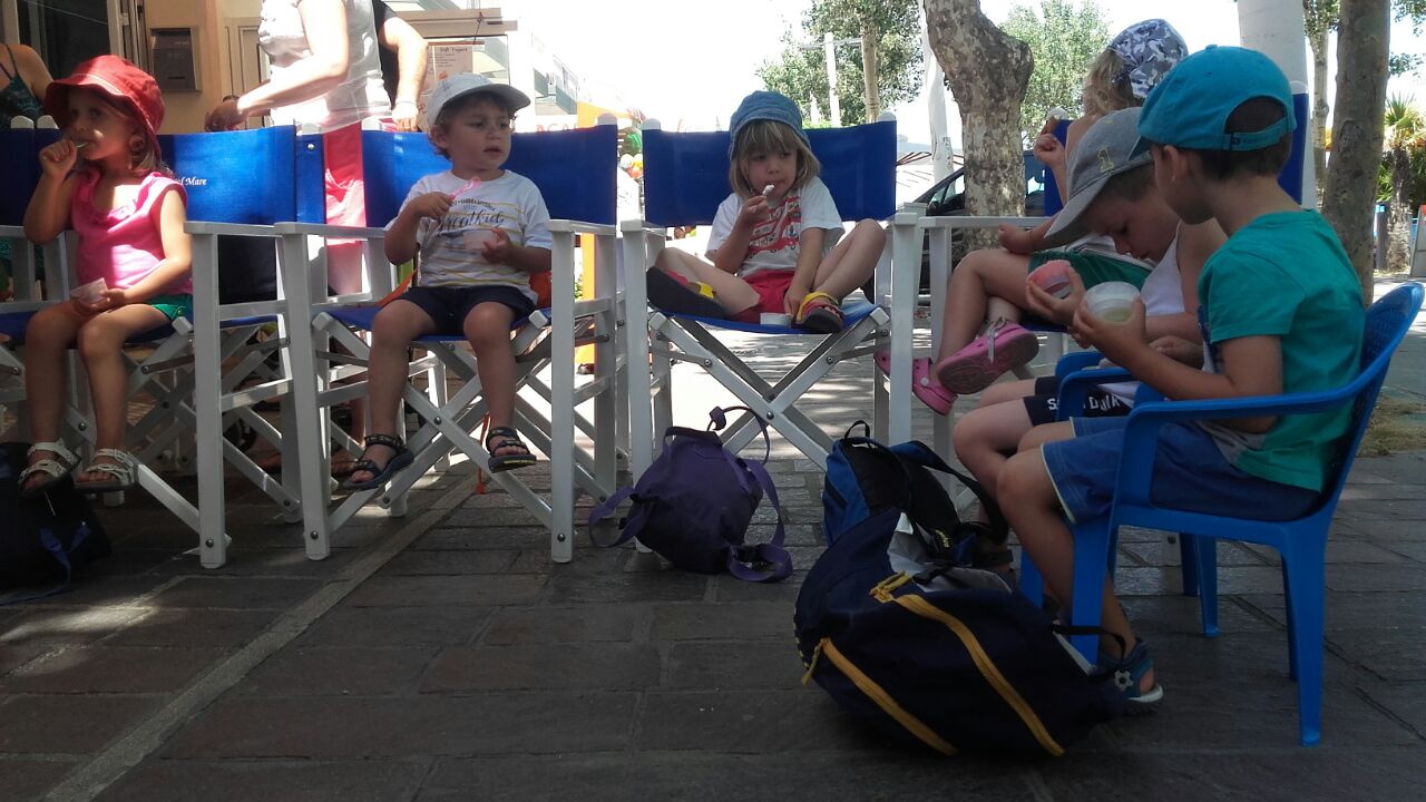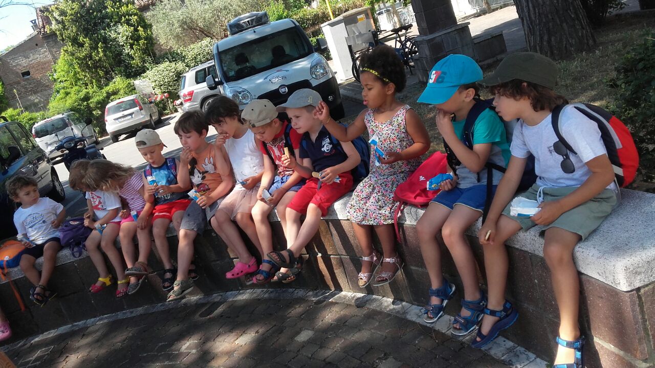 Tutti i bimbi con lo zaino in spalla, si riprendono per mano e, una volta scesi dal treno, ci avviamo verso una piazzetta all’ombra dove ci fermiamo a fare merenda e bere un po’ di succo.
