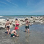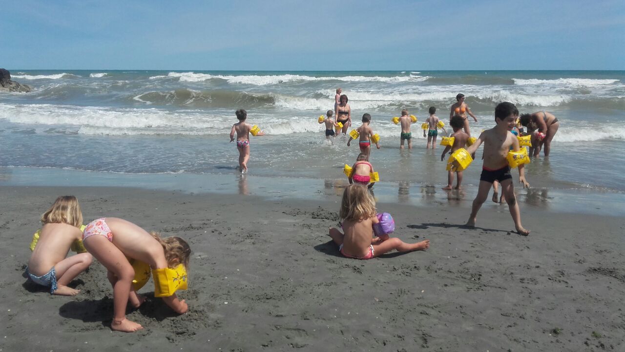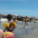 I bimbi non vedono l’ora di buttarsi in acqua, con l’accordo di indossare TUTTI i braccioli e di non oltrepassare il limite dato.