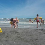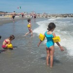 Bene, ora siamo pronti per la spiaggia! Ma ecco un’altra sorpresa: il mare è mosso, con grandi onde e un bagnino che, appena ci vede arrivare, fa una faccia incredula mista a stupore! Ma noi non ci facciamo certo intimidire, anzi! Con tre istruttrici di nuoto, di cui due bagnine, non ci siamo affatto spaventate per due onde!!!