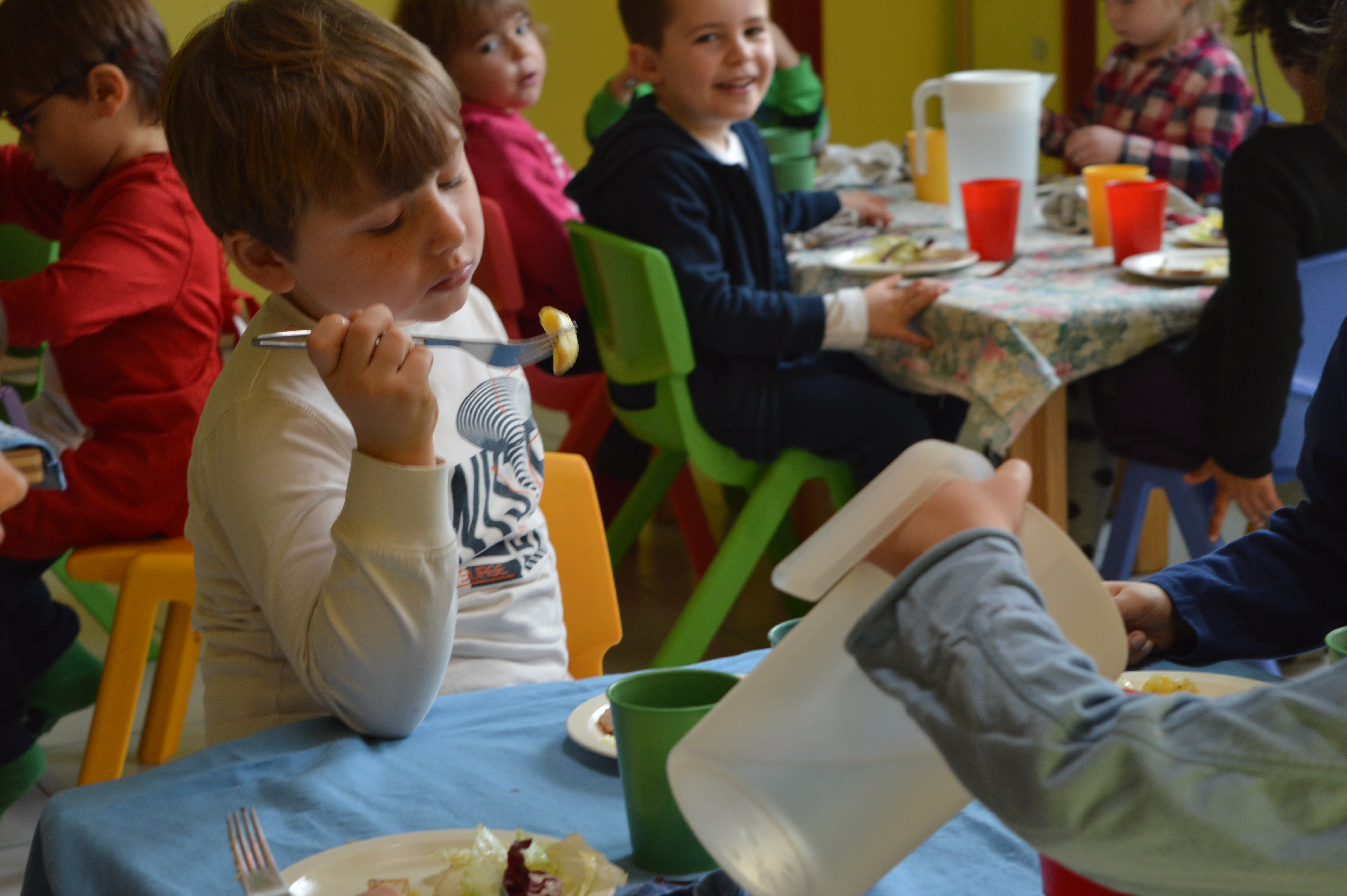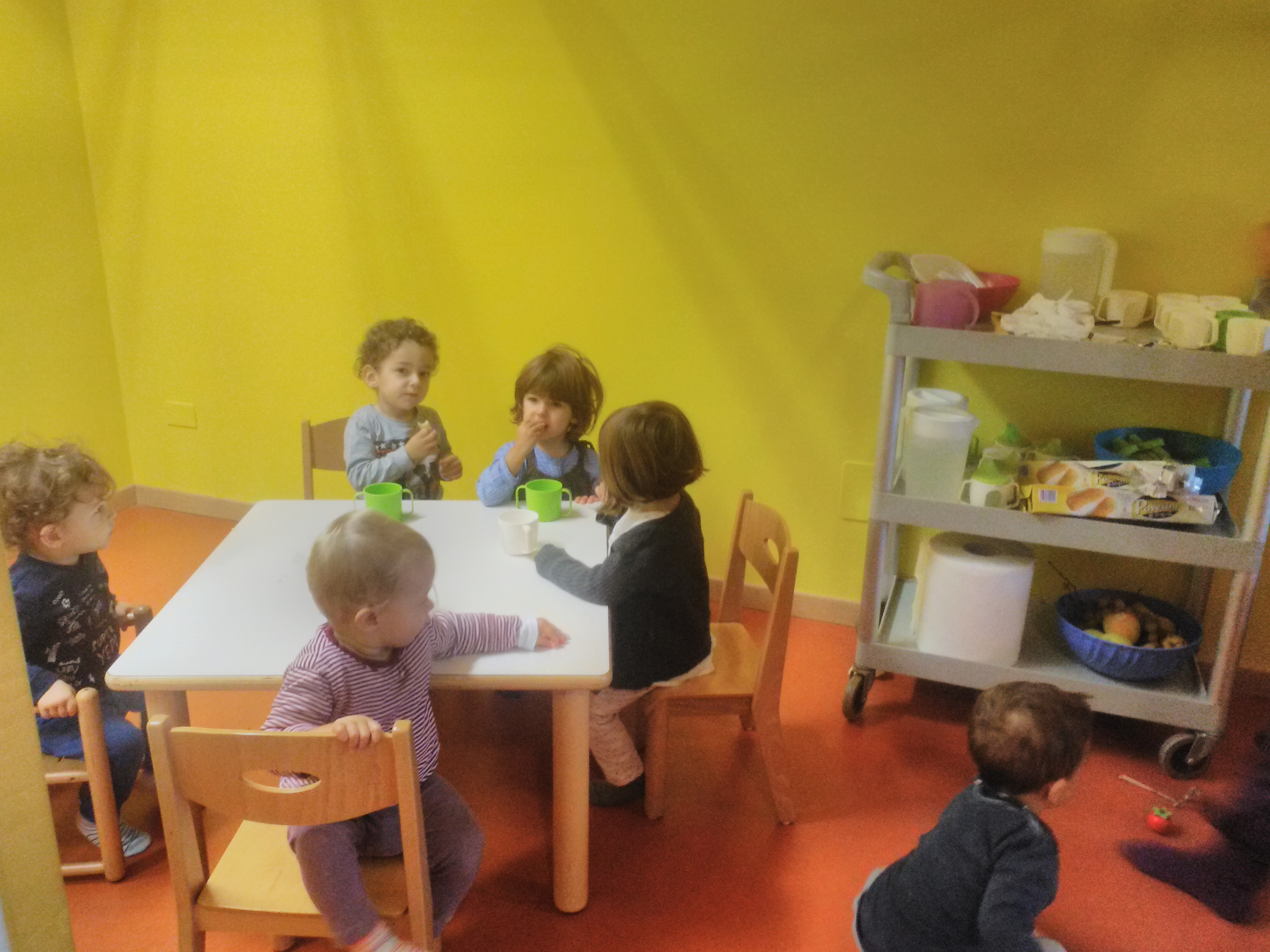 Lo scenario è divertente: c’è chi corre letteralmente in cucina, chi si dirige con calma, chi ha fame ​ma non troppa​ e guarda l’amico con cui sta giocando per capire se vuole andar subito o aspettare ancora un po’. I posti sono limitati, si va 5 alla volta e loro lo hanno imparato da subito, così dopo o durante i vari giri di merende si vede un bimbo che si affaccia per vedere se c’è qualche posto per sedersi, o una bimba che per mano all’amichetta ti chiede con naturalezza sorprendente “quante sedie libere ci sono?”