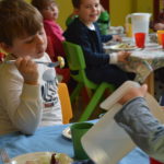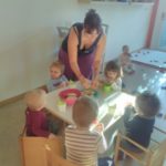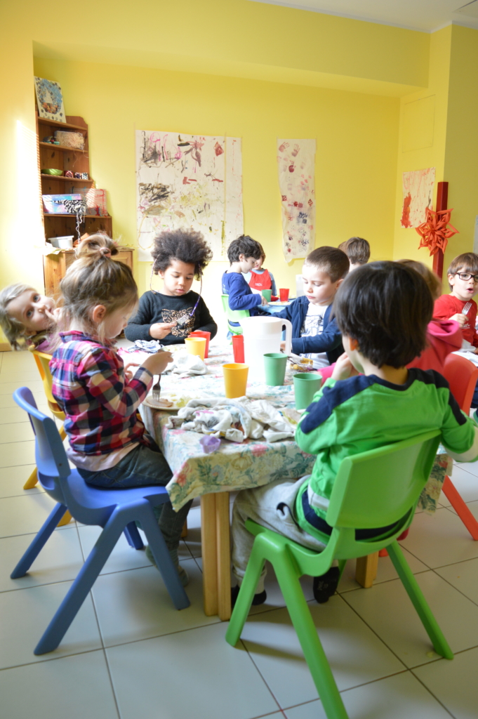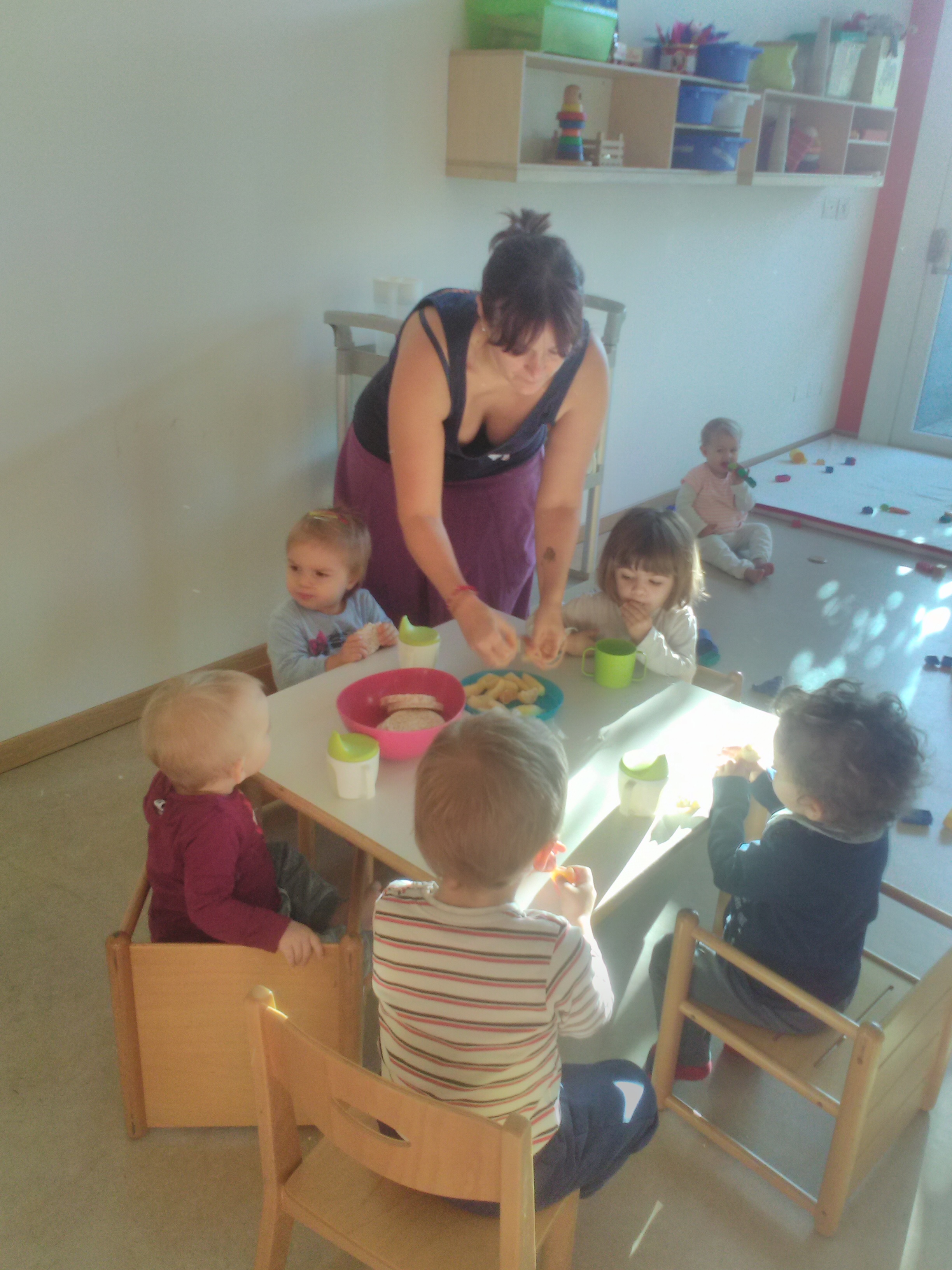 Le dade prima del​l’​arrivo​ dei bimbi​ scelgono cosa proporre sulla tavola apparecchiata e imbandita da piccoli ‘gourmet’: tanta frutta – un po’ intera, un po’ tagliata, un po’ con la buccia e un po’ senza – qualche biscotto, un po’ di salato, e il gioco è fatto! Non resta che aspettare le 9.00, quando il cartello sulla porta della cucina si gira e avvisa tutti che chi ha il pancino che brontola può andare a fare merenda.