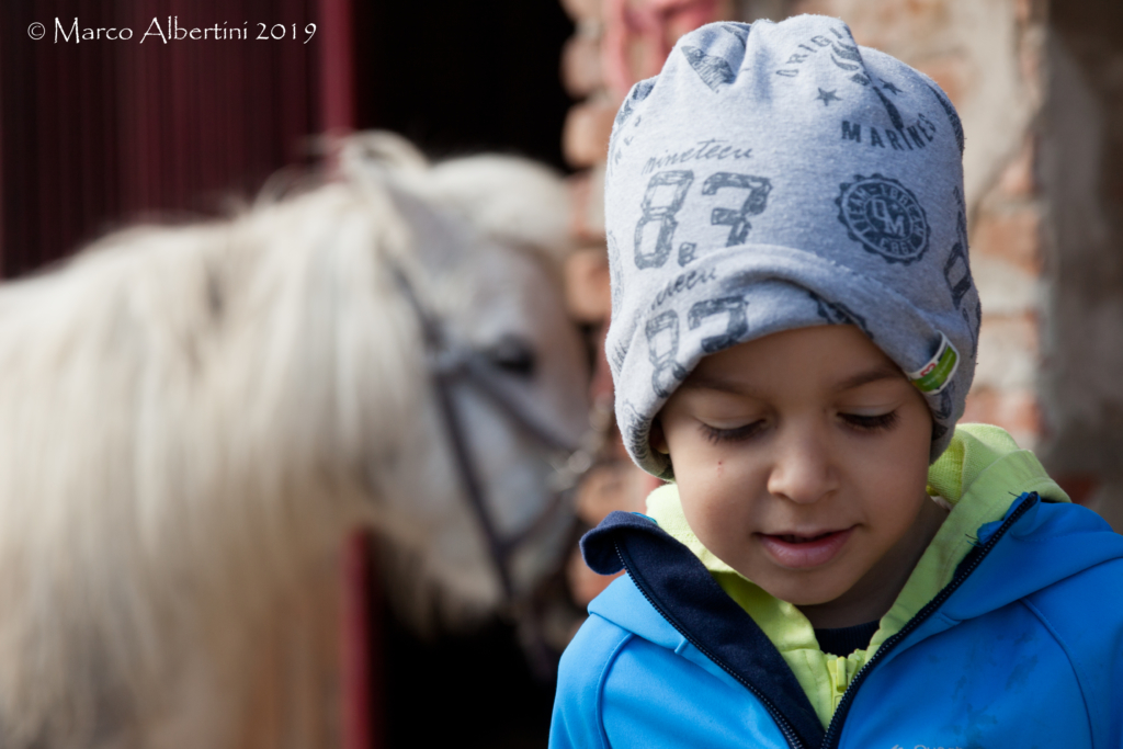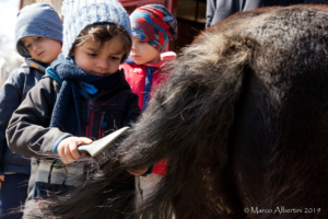 I sorrisi dei bimbi sono incredibili così come la cura nel seguire tutte le indicazioni: puliscono, pettinano, dicono parole gentili, ascoltano e infine ecco che si mette la sella e arriva un piccolo momento magico: seduti sul pony si è davvero in alto.