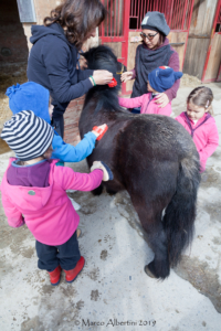 Valerio e Lula andavano sono andati a prendere i pony e i cavalli chiamandoli per nome, ognuno nel proprio spazio dove dormono e mangiano alla sera. Ci hanno raccontato che quella è un po’ come la loro cameretta e ogni sera vanno sempre nel loro posto, vicino all’amico con cui stanno meglio perchè anche loro hanno simpatie e antipatie.