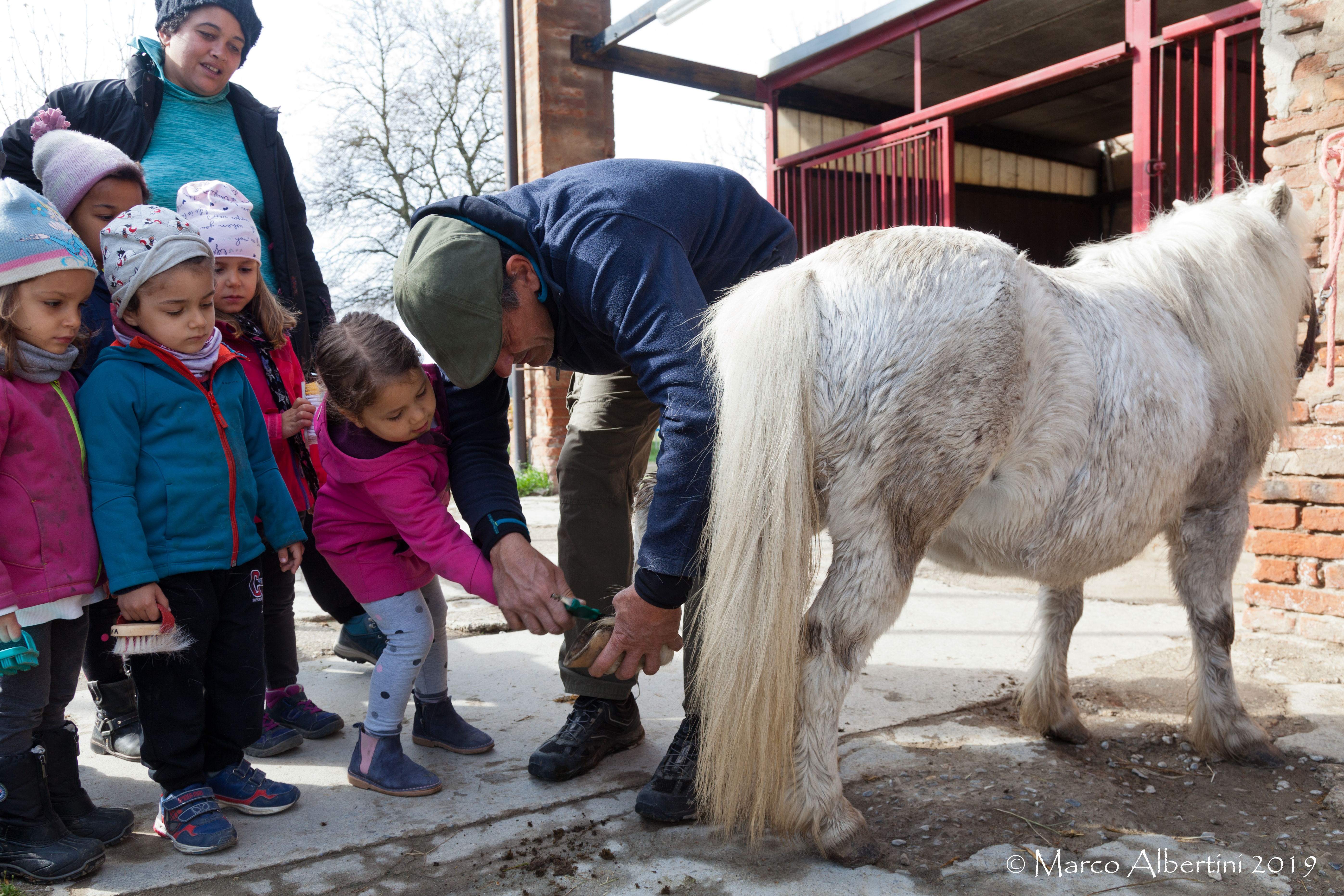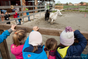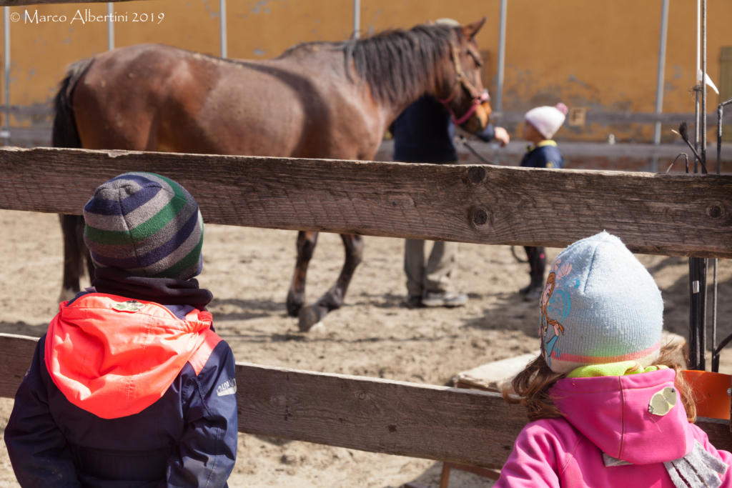 Ci siamo trovati là accompagnati dai genitori, e accolti dalle dade in mezzo ai cavalli che man mano iniziavano a uscire dai box per godere del sole e del prato.