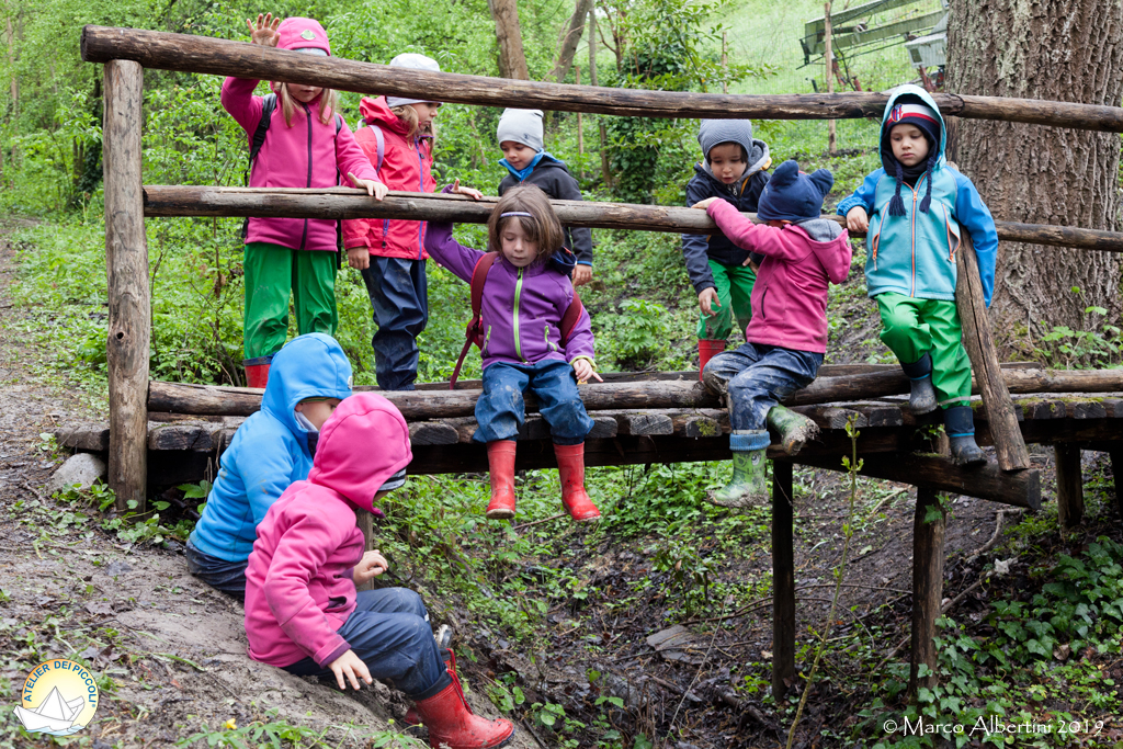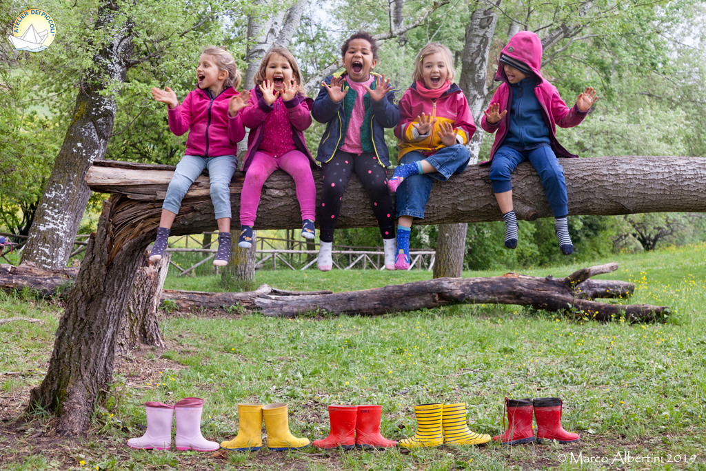 Bagnati e infangati ma ben avvolti nelle nostre tute finalmente ci togliamo gli stivali e mettiamo a stendere i calzini godendoci il pranzo su un meraviglioso ramo che si trasforma in un treno e in molte altre inaspettate situazioni per continuare a giocare e stare semplicemente bene insieme.