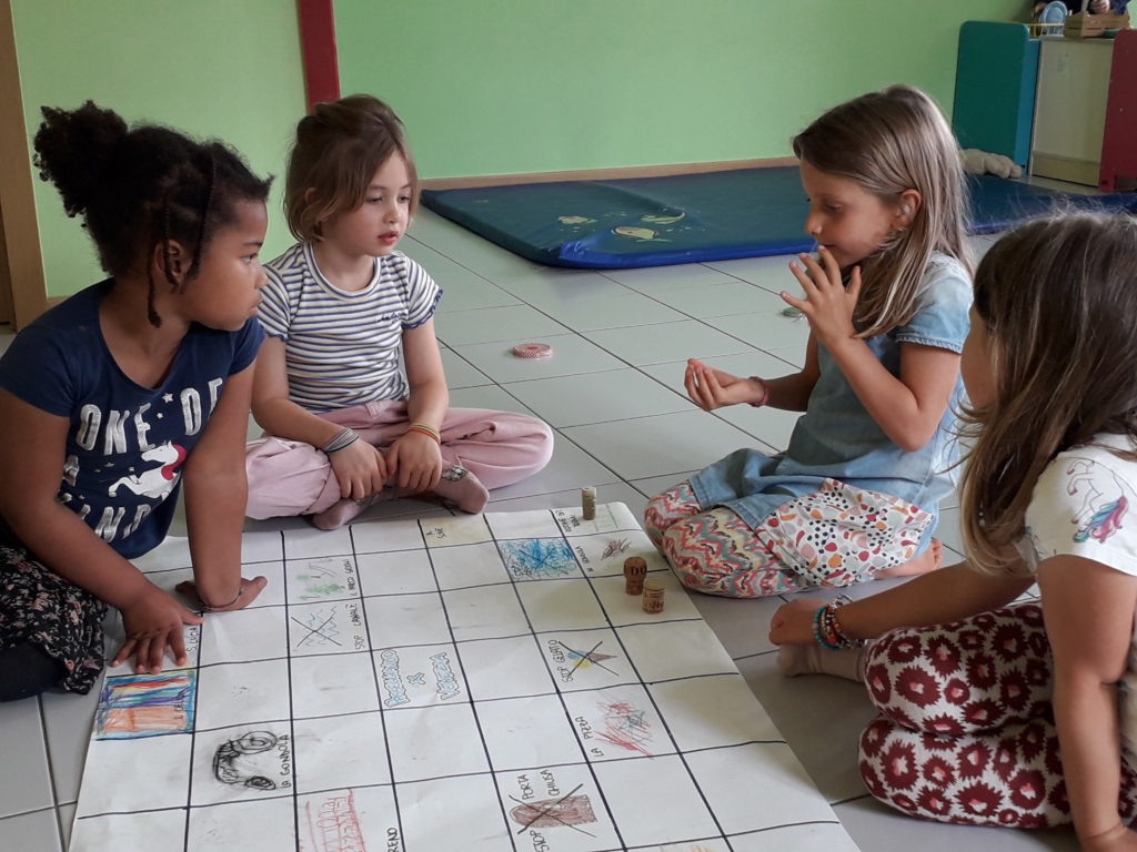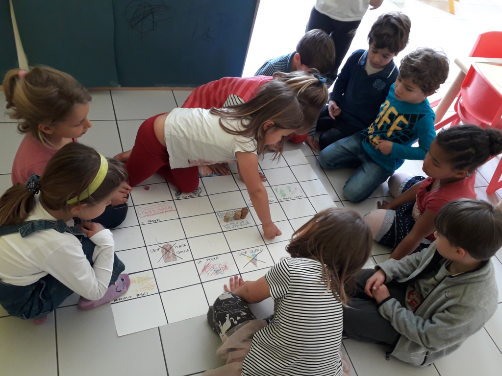 Ma per giocare ci mancava un dado, ma questo non è stato un problema, perché molti bimbi, desiderosi di provare il nuovo gioco, si sono ricordati di cercarne uno a casa e come per magia, il giorno dopo, avevamo 5 dadi! Quindi non rimaneva che cercare delle pedine tra i giochi (tappi, bottoni, fiorellini…) e iniziare a programmare il percorso per raggiungere la chiesa, il parco…saltando però gli ostacoli previsti (acqua alta, gelato…).