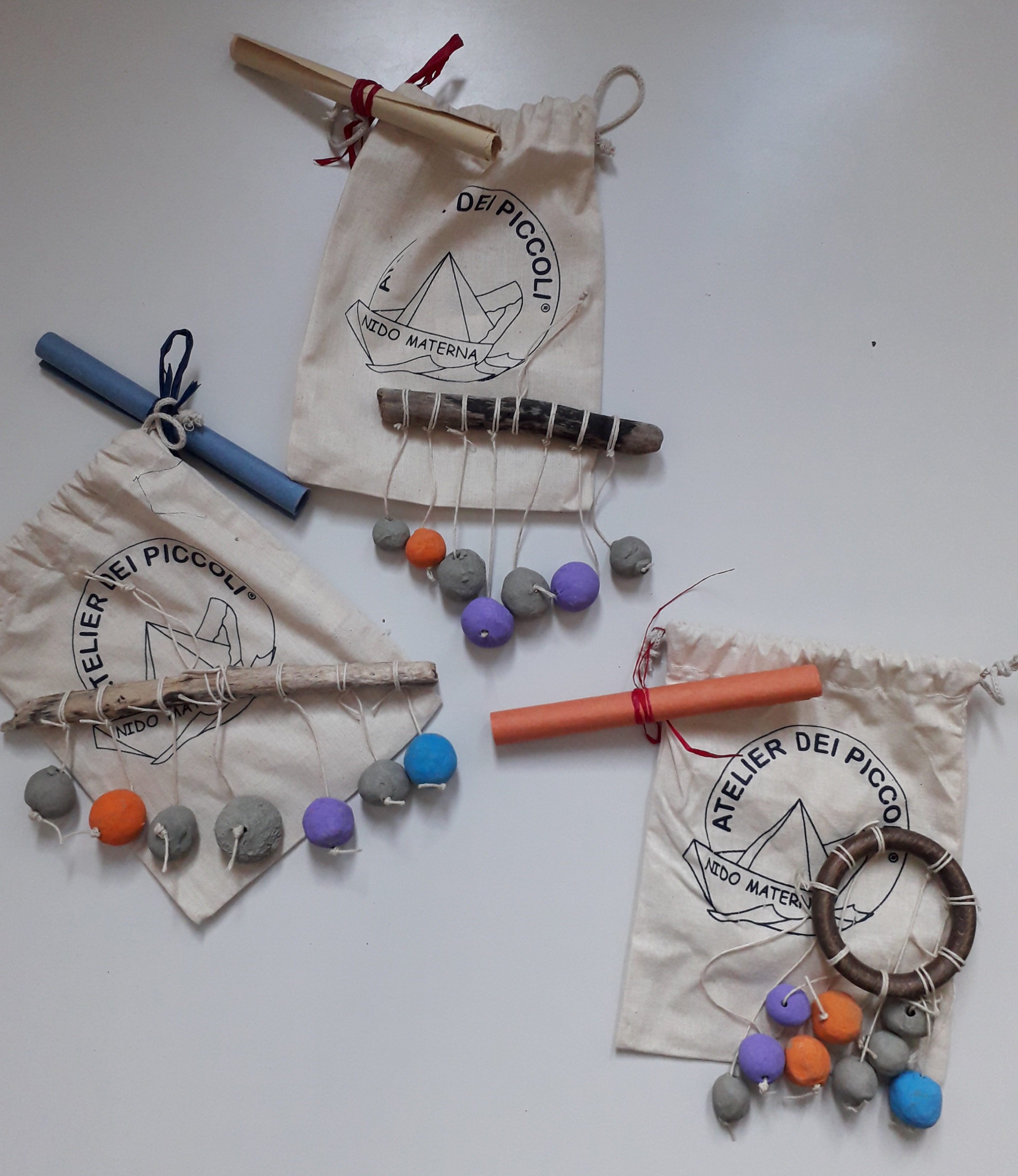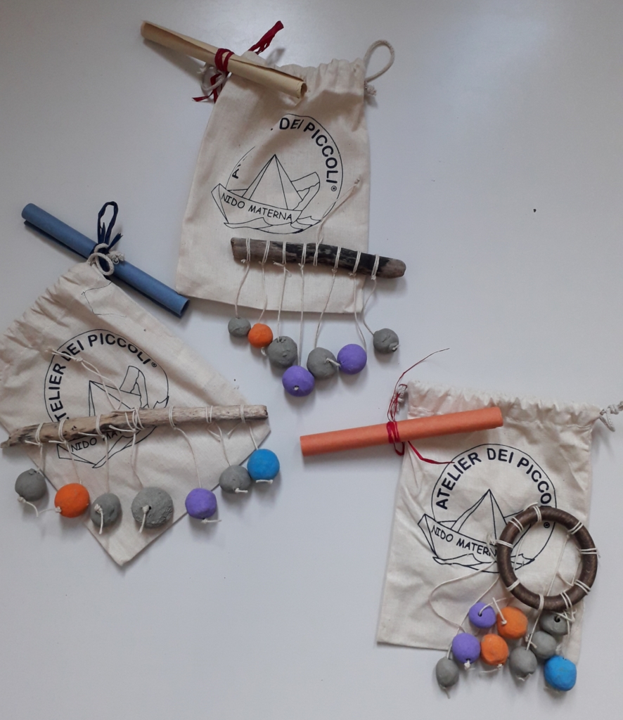 Ci sono gli scaccia pensieri dei bimbi piccoli del nido, che l’anno prossimo saranno ancora in Atelier, circolari, con le palline di argilla che scendono a spirale appese ad una anella di legno.