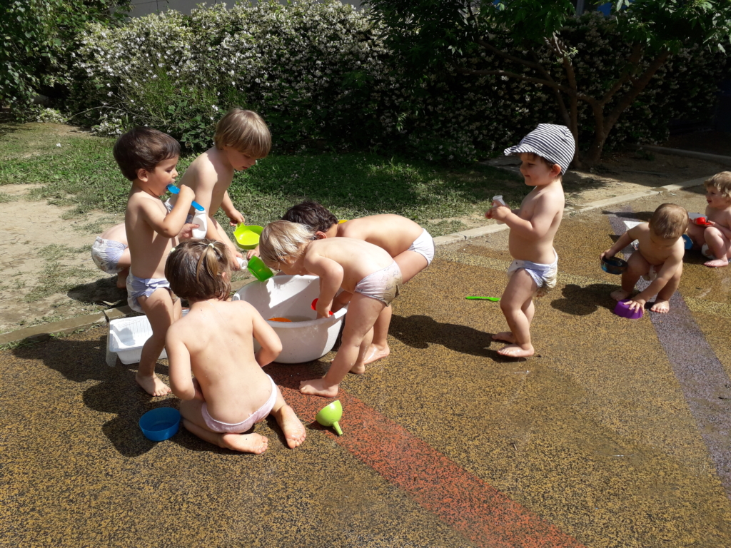C’è chi si siede comodo e comincia a trasferire l’acqua da un contenitore all’altro con cura, attento e dedito al suo lavoro ma molto divertito dal bagnarsi, dal restare in pannolino o in slip e rovesciare rivoletti un po’ ovunque.