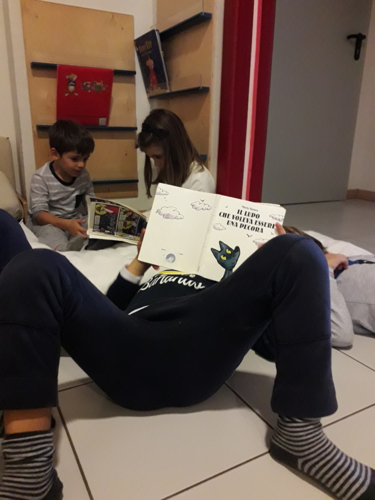“Bene… allora oggi ho scelto un libro che si chiama “Il piccolo Bruco Maisazio”… e inizia così… in una giornata di domenica mattina con il sole…C’era una volta un bruco appena nato…tanto affamato…”