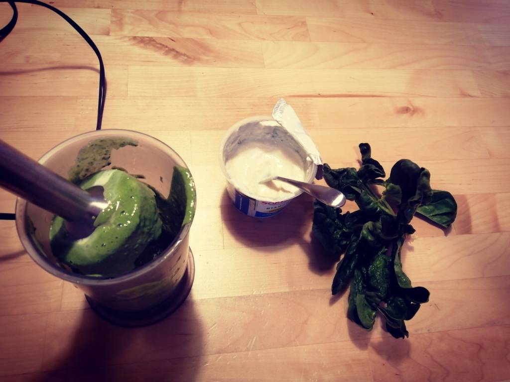 Frullare 4 cucchiai di yogurt con 5 foglie di spinaci