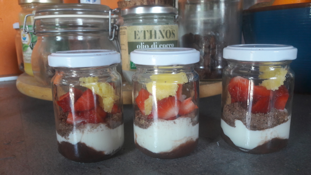 Infine la decorazione e come fare a meno delle fragole in questa stagione: belle, buonissime e con un colore che da un tocco di vitalità al nostro barattolino. Tagliatele a pezzettini piccoli ma non serve condire ne addolcire, insieme agli altri ingredienti renderà tutto il suo sapore.