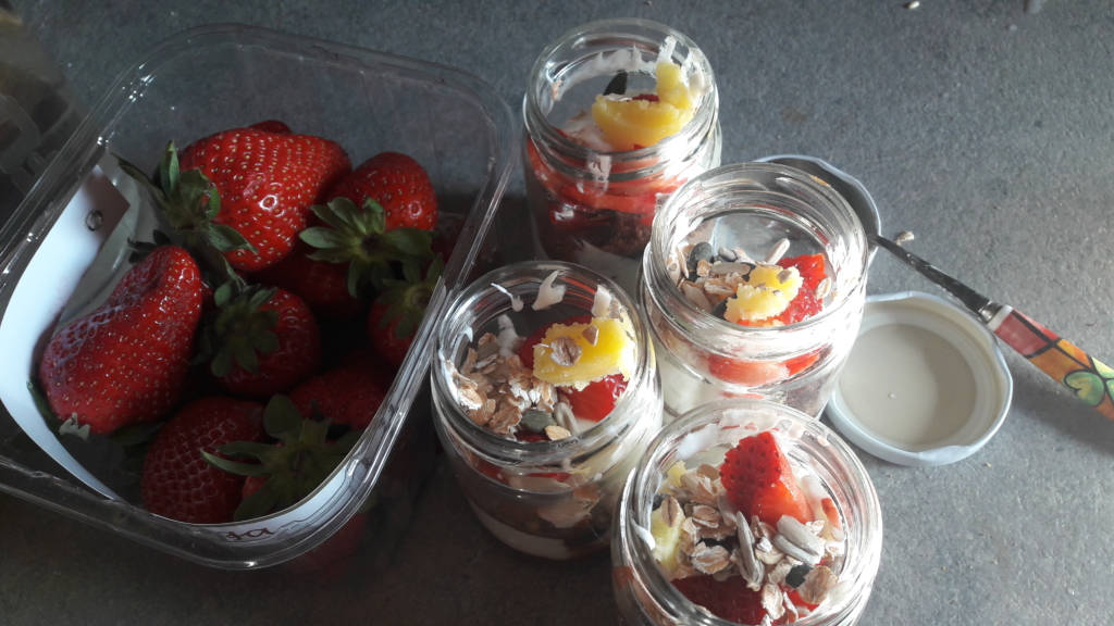 Potete aggiungere un cucchiaino abbondante di cereali da colazione o un biscotto sbriciolato e non l’avete messo alll’inizio e poi un nuovo strato abbondante di yogurt.