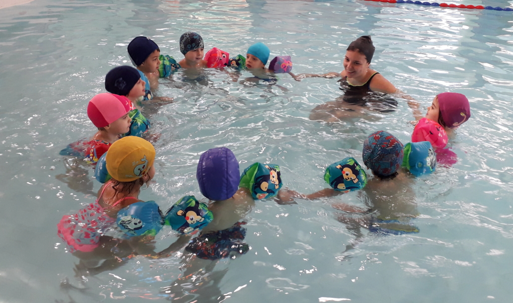 Finalmente approdiamo con il nostro vascello sul bordo vasca pieno di piccoli esploratori che fremono dalla gioia di poter fare un tuffo in acqua.