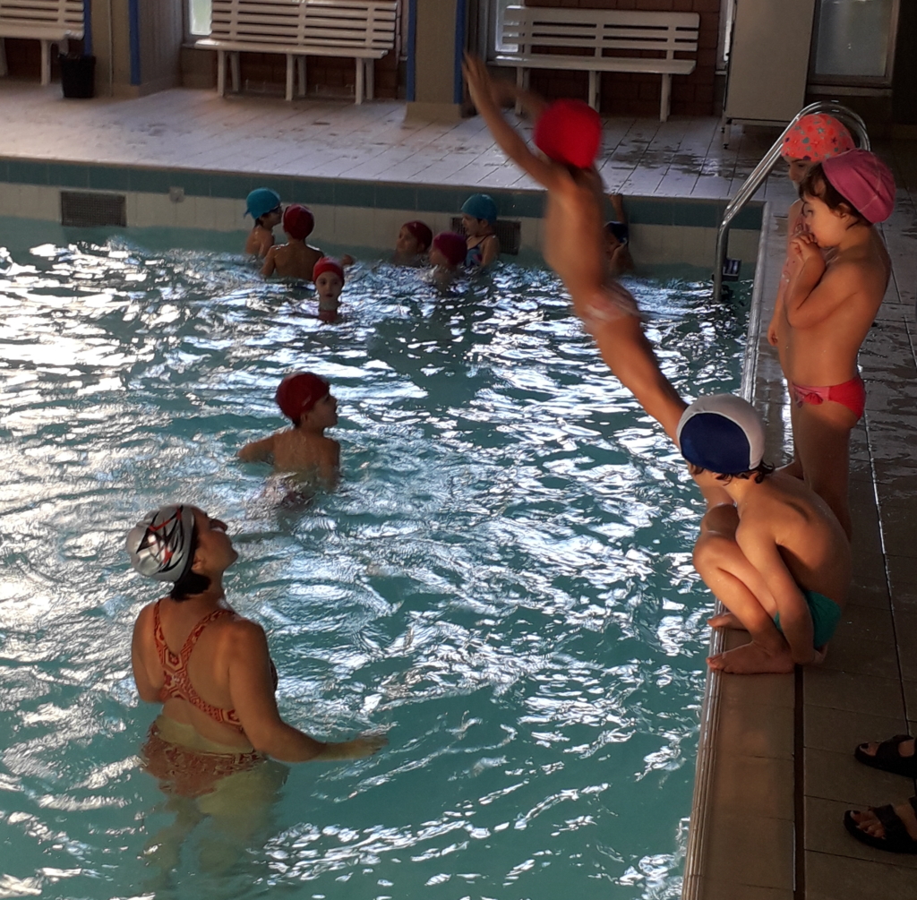 Finalmente approdiamo con il nostro vascello sul bordo vasca pieno di piccoli esploratori che fremono dalla gioia di poter fare un tuffo in acqua.