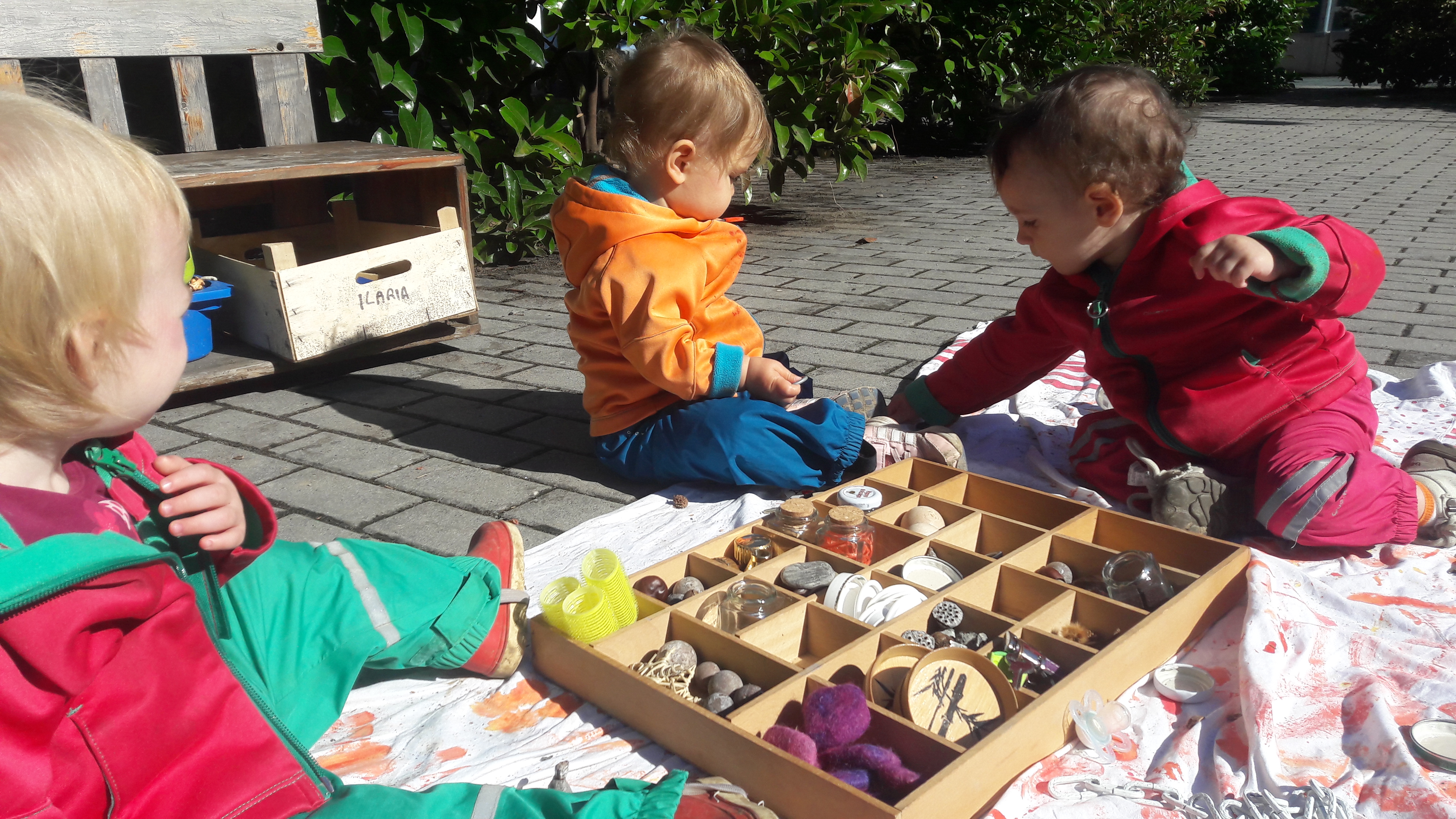 Poi una mattina mentre faccio un piccolo laboratorio nel giardino piastrellato con i bimbi grandini del nido, ecco che passano i piccoli della materna a pochi me
