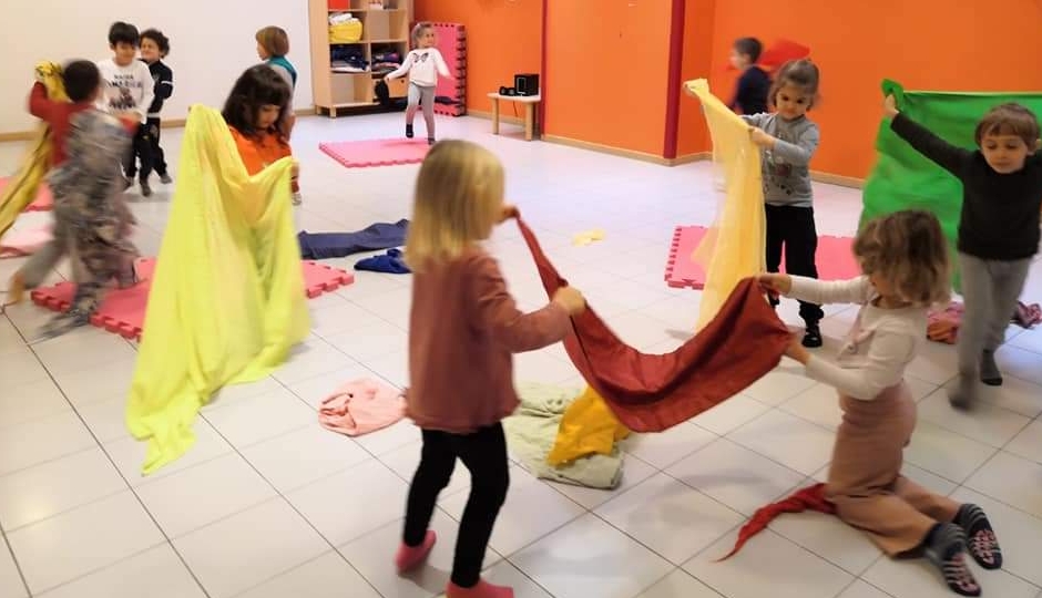 C’è sempre la musica che ci accompagna, ci sono i nostri tessuti, ci sono le dade che ci aiutano in caso di bisogno e c’è un gruppo, di bimbi e dade, che sente, si muove, vive e accoglie quello che c’è.