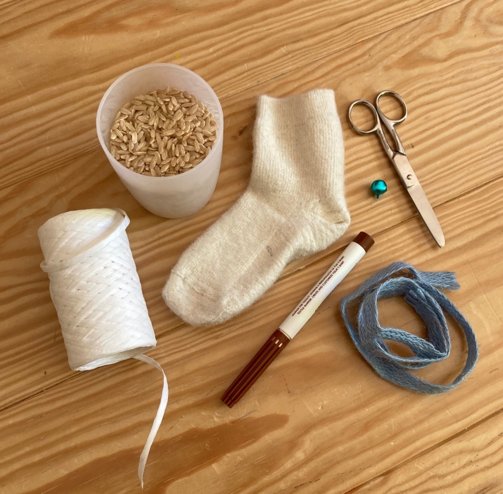 Chiedete al vostro bimbo di versare del riso dentro il calzettino con l’aiuto di un bicchierino e legate appena sopra con un po’ di corda in modo da lasciare circa 3/4 dita di tessuto che vi servirà per creare le orecchie successivamente.