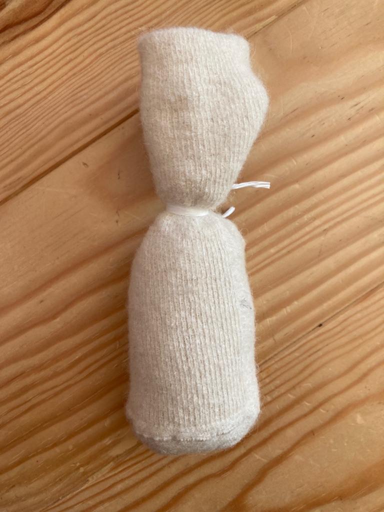 Chiedete al vostro bimbo di versare del riso dentro il calzettino con l’aiuto di un bicchierino e legate appena sopra con un po’ di corda in modo da lasciare circa 3/4 dita di tessuto che vi servirà per creare le orecchie successivamente.