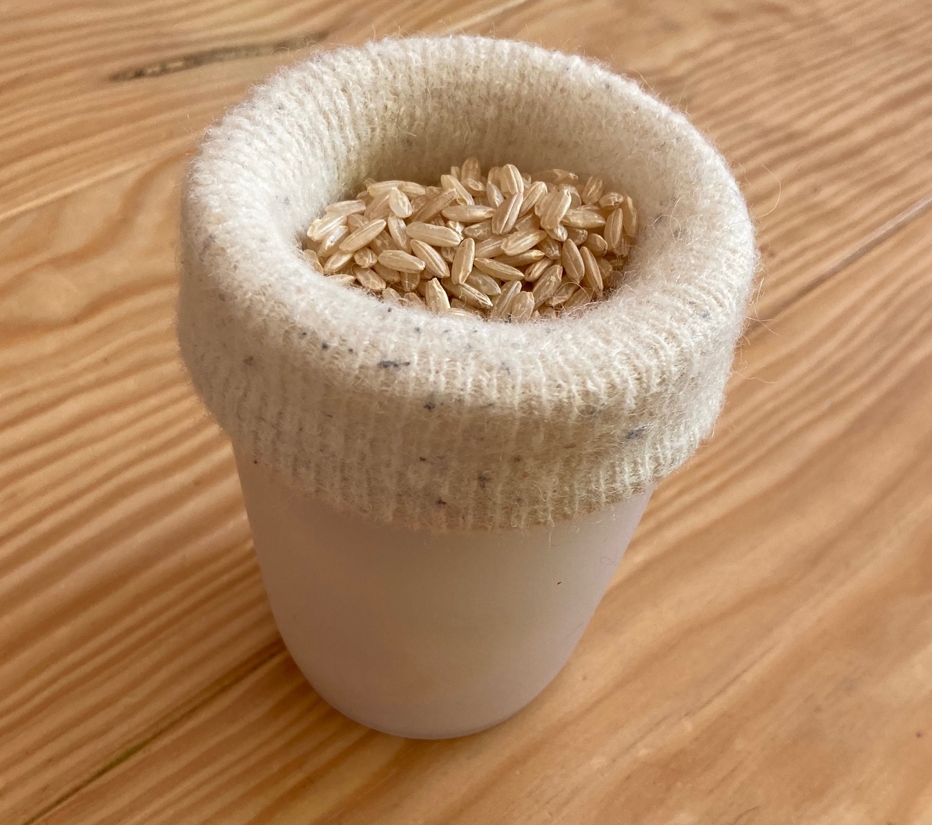 Mentre il vostro bimbo sarà impegnato con qualche travaso (preparate un po’ di ciotoline, un cucchiaino e del riso), prendete il calzettino che avrete scelto, infilatelo nel bicchiere e fate un piccolo risvolto intorno ad esso per rendere più facile il passaggio successivo.