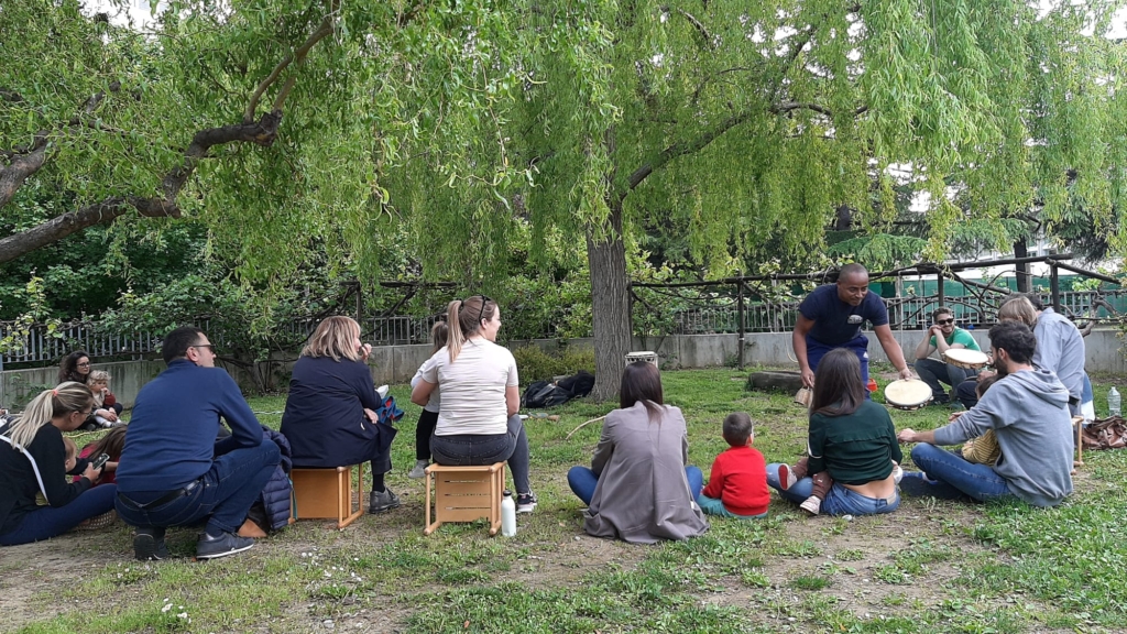 Ci sparpagliamo nel prato e proviamo a seguire tutti insieme i movimenti armonici e acrobatici della capoeria! Tante risate, facce stupite e imbarazzate ma la musica aiuta sempre a sciogliere le incertezze e alla fine ci mettiamo in cerchio per concludere questo bel pomeriggio di giochi condivisi, di chiacchiere e risate e soprattutto di musica.