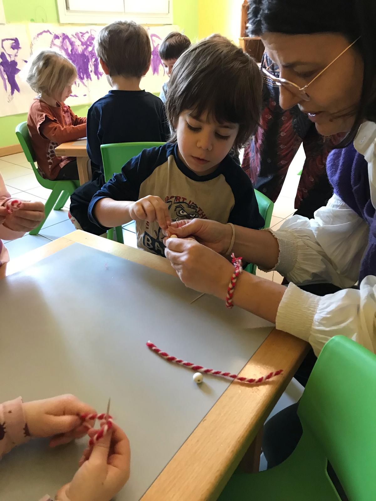 Abbiamo così creato ciascuno un braccialetto da indossare aspettando la primavera… Potremo donarlo a un albero non appena vedremo sbocciare i primi fiori perché cresca forte e in salute. La tradizione della “martenitza” celebra la primavera, simboleggia una nuova vita, il concepimento, la fertilità e la primavera e esprime la necessità di armonia nella nature e nella vita di ciascuno.