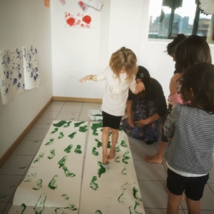 Le macchie di colore di ” Per fortuna” le abbiamo ritrovate sotto forma di tempera verde e blu, con la quale ci siamo colorati mani e piedi e abbiamo tracciato le nostre orme sopra ad un grande cartellone.