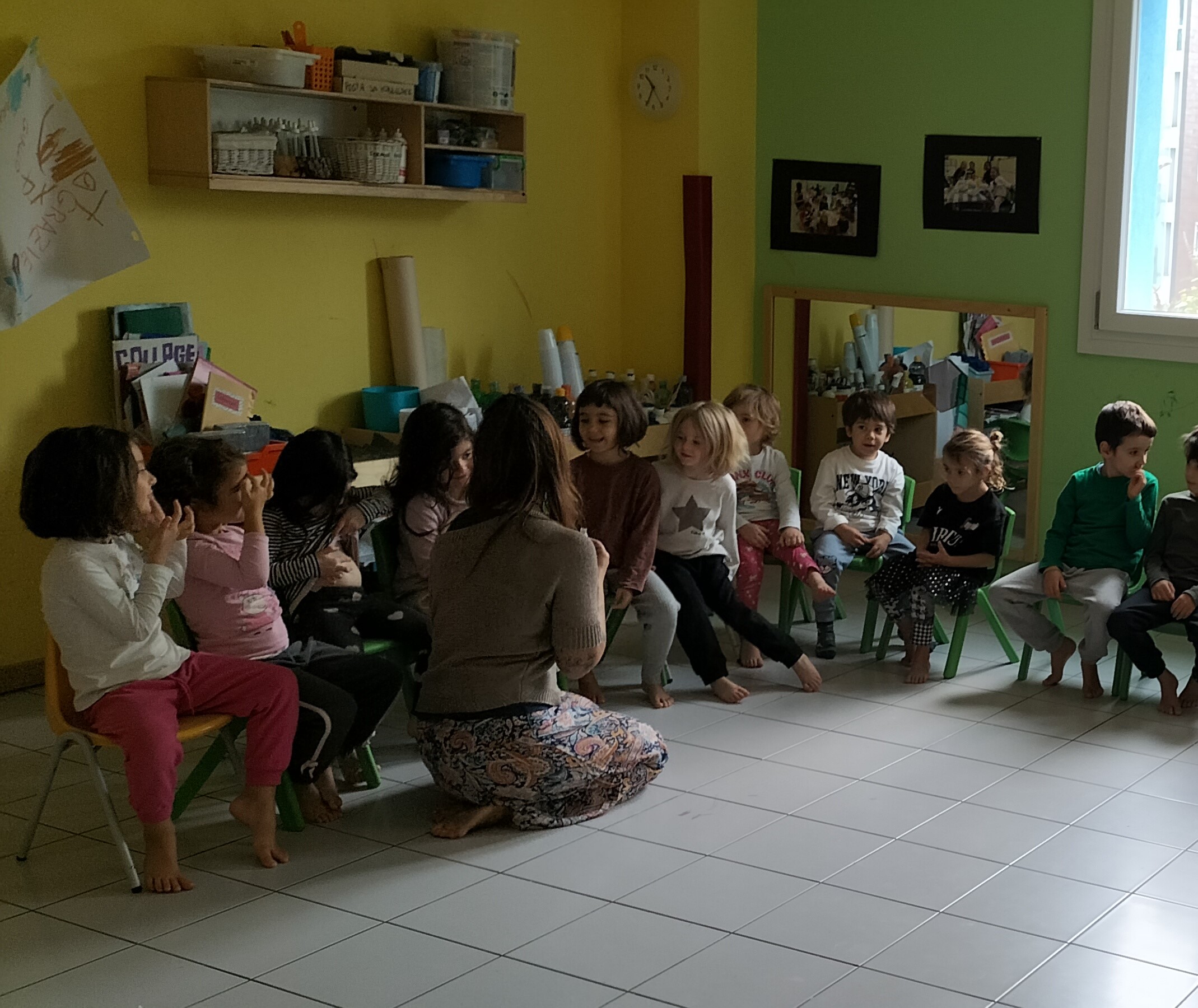 Una mattina di maggio decido di prendere dalla libreria al piano Aquile proprio lui: davanti a me ho un bel gruppo di bimbi curiosi che non vedono l’ora di scoprire cosa racconterò. In effetti la copertina è molto simpatica e colorata! È un nuovo libro regalato da poco da una famiglia dell’Atelier… Sono curiosa anche io, senza esitazione decido di improvvisare e leggerlo direttamente con i bimbi.