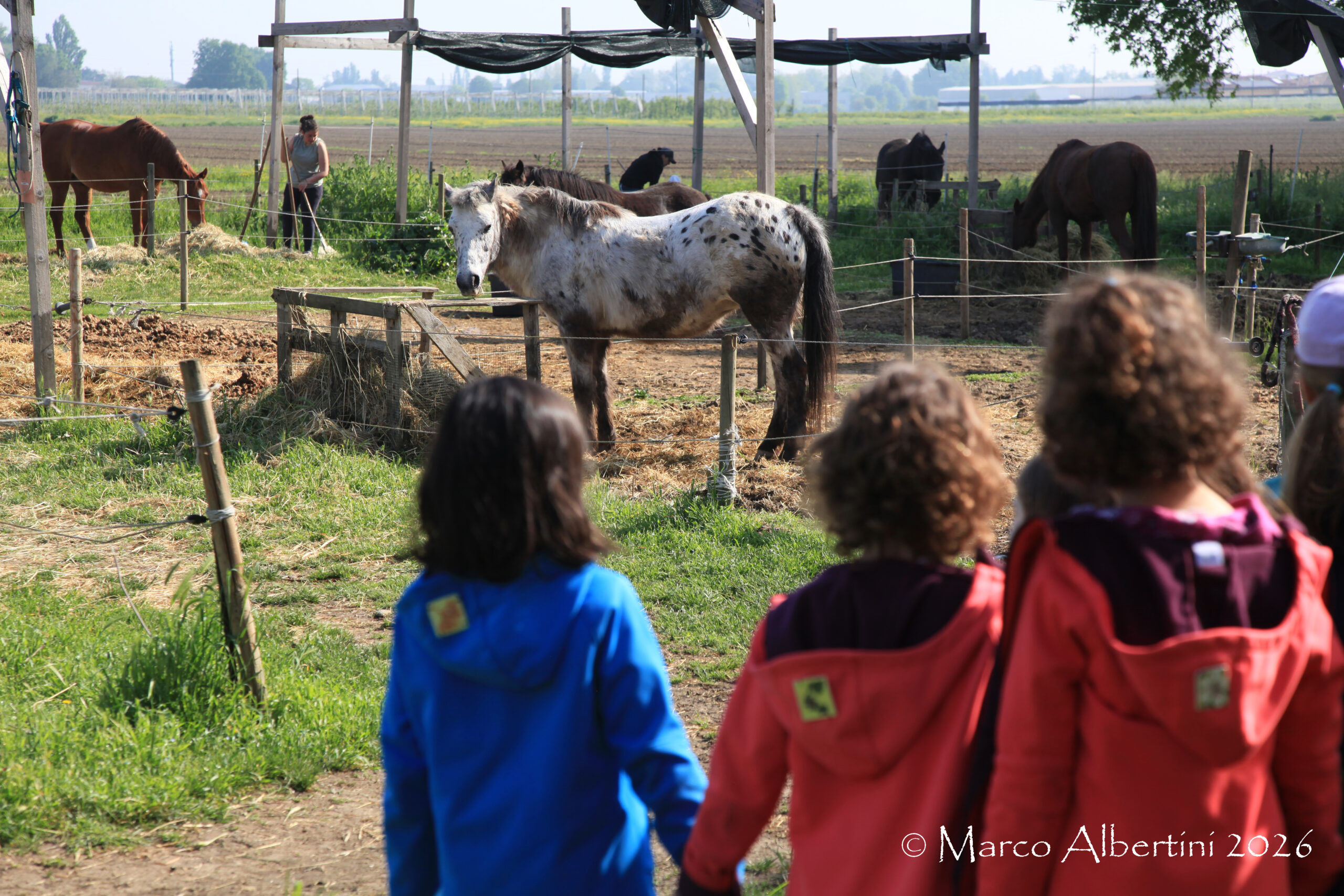 Siamo davvero emozionati e infine incontriamo un cavallo che ha perso un occhio in un incidente e che deve girarsi dalla parte giusta per osservarci. Quante domande che nascono da questo incontro: proviamo anche noi a chiuderci un occhio per capire come fa a vedere, e come fa a fare una vita normale …poi ridiamo a vederlo giocare con un pezzo di legno tirando e mordicchiando.