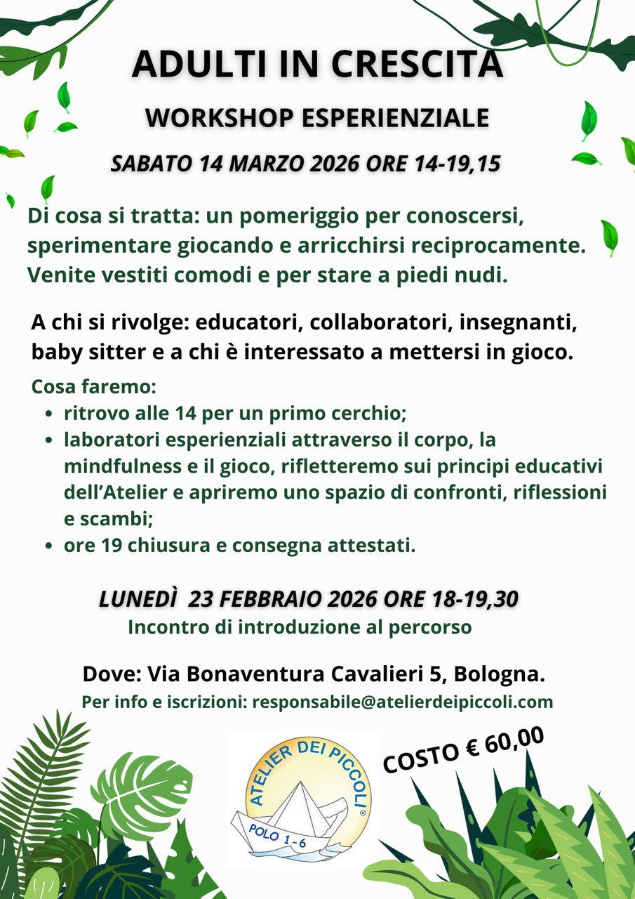 Inoltre per chi è iscritto al percorso è prevista la partecipazione gratuita ad una delle serate per adulti tenuti in primavera e focalizzate ogni anno su tematiche specifiche e sui principi educativi dell’atelier.